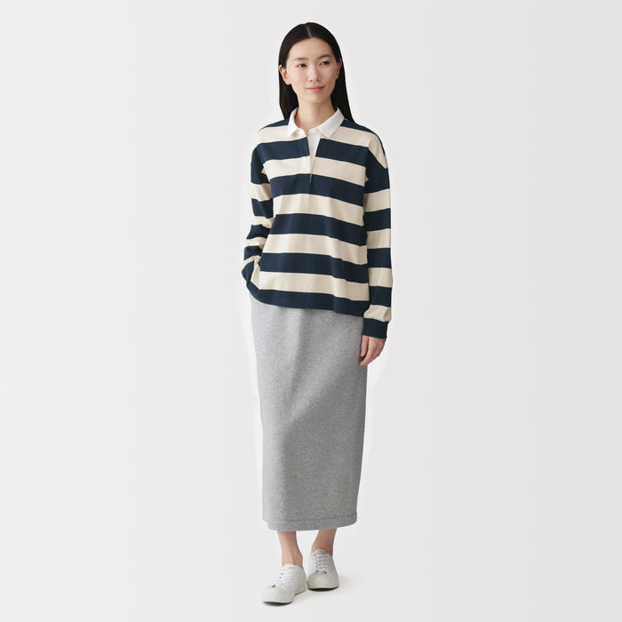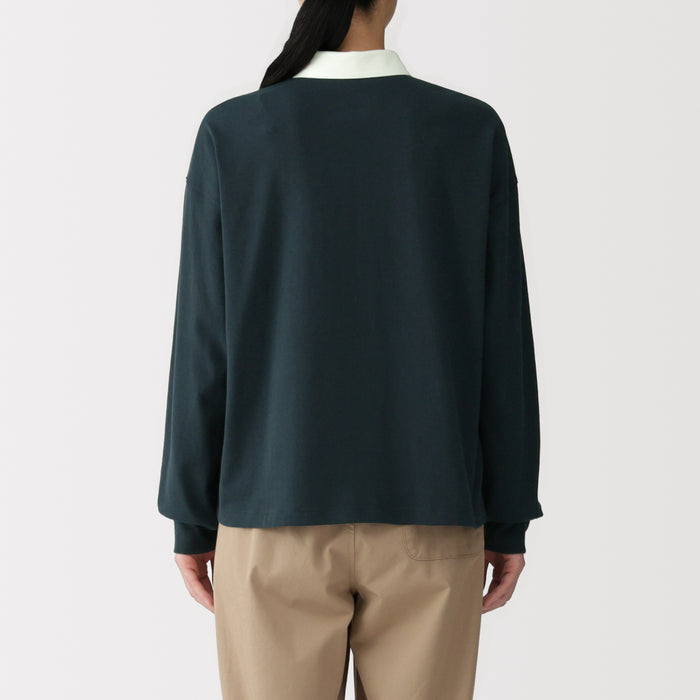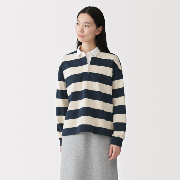 This women's rugby shirt is made with 2-ply organic cotton jersey material, providing the perfect amount of thickness for comfort and durability. The collar and short placket give this shirt a classic, preppy look that suits any outfit.