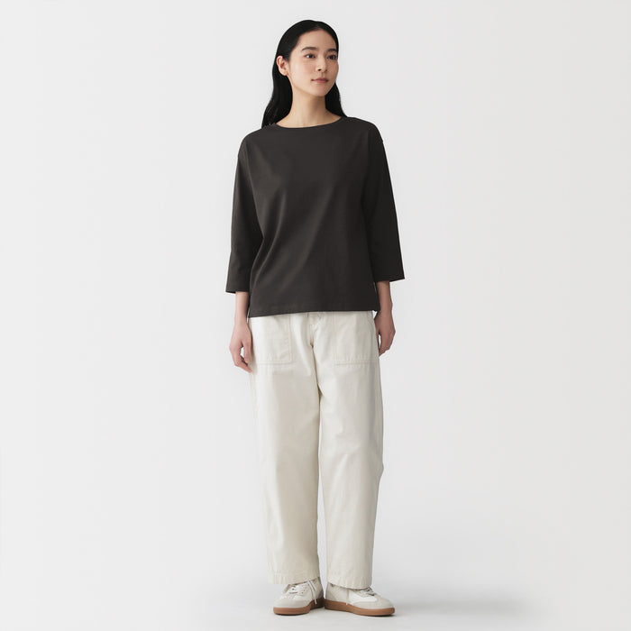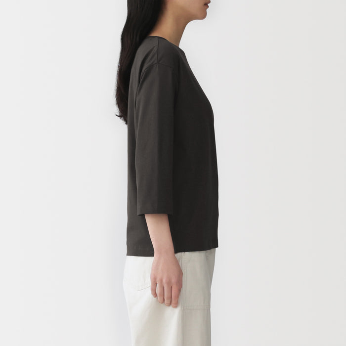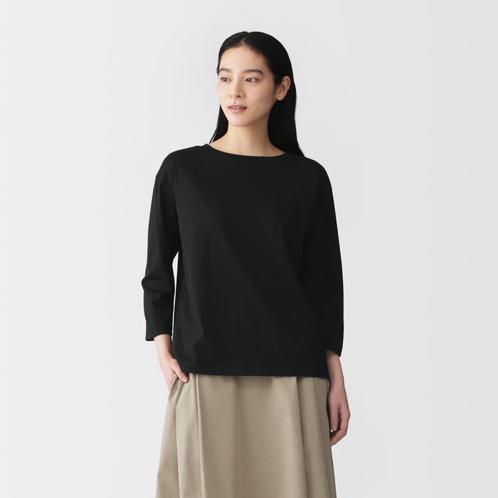 A women's boat neck T-shirt with 3/4-length sleeves, made from a soft and smooth cotton blend that feels comfortable on the skin. The wide neckline and moderately loose sleeves allow for comfortable and easy movement.