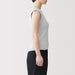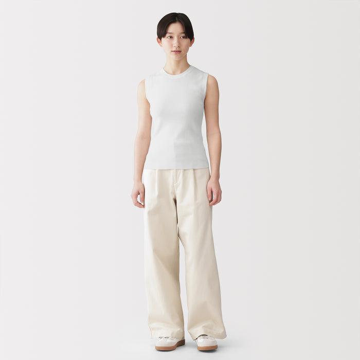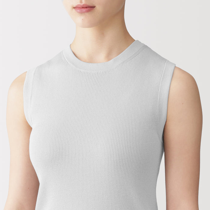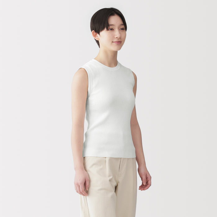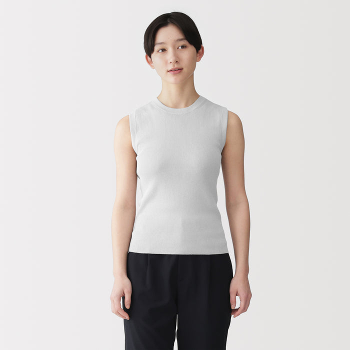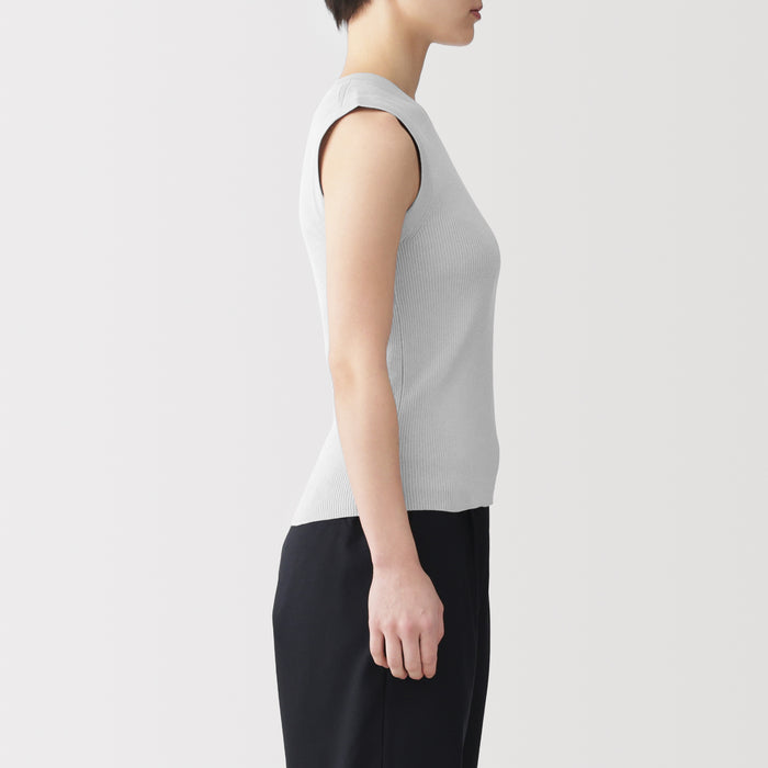 A women's sleeveless sweater made with lightweight, airy cotton blend material that is perfect for wearing in warmer weather.