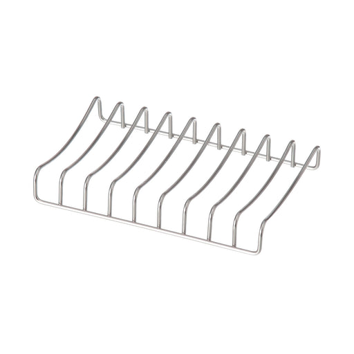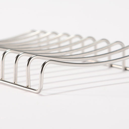 A rust-resistant, simple soap dish made from stainless steel wires.