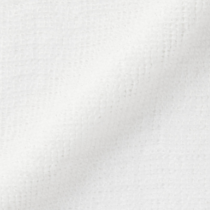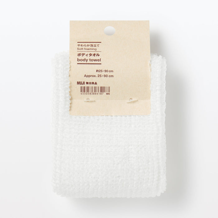 A towel made of a polyester and cotton blend, designed with a three-dimensional mesh pile that can quickly and easily create a lather. The material is soft, stretchy, and gentle on the skin.