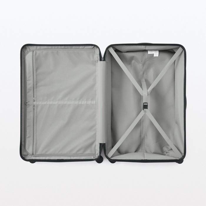 The interior has a buckle strap and zippered partition with two mesh pockets to keep your clothes and essentials in place while in transit. Our wide range of packing cubes also fit perfectly inside the suitcase for even more organization options!