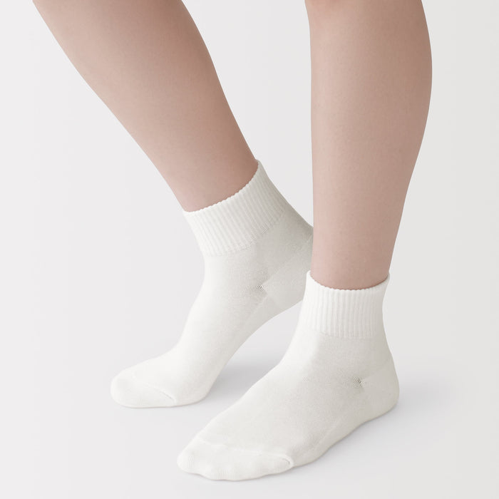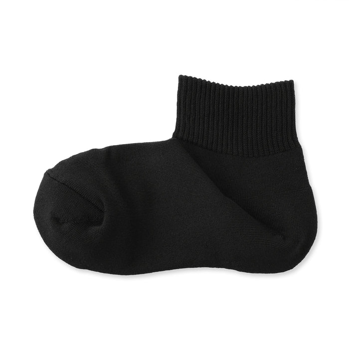Soft pile-knitted sole using cotton-rich yarn, with a sweat de-odorizing effect. The top cuff is designed to be less tight so it is more comfortable to wear. As the heel is at a right angle, the socks are knitted at a right angle to wrap comfortably around the heel and prevent the fabric from sagging and slipping off.