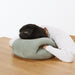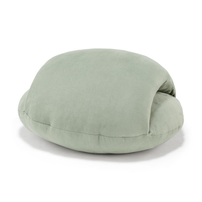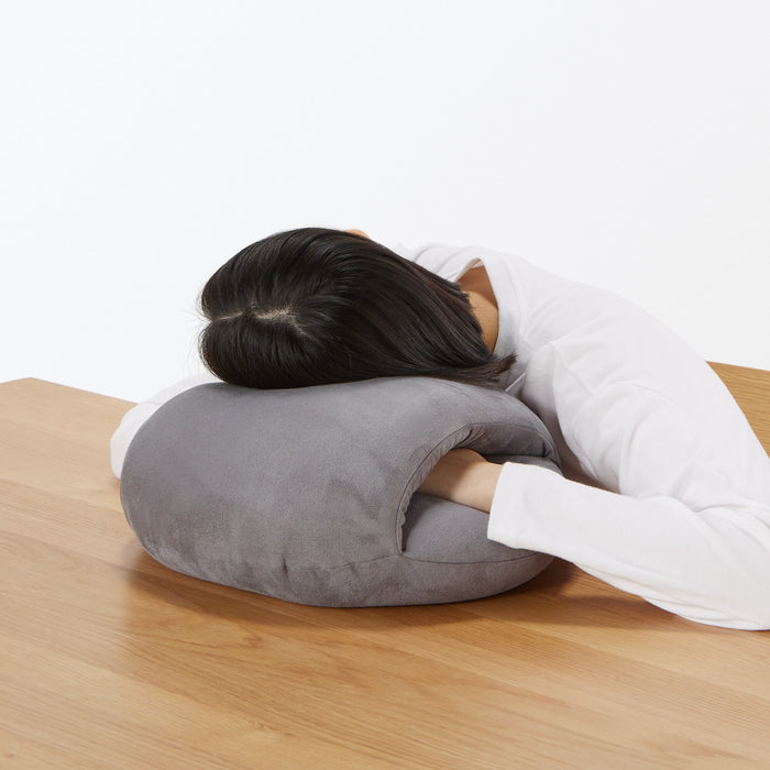 Take a restorative break anywhere with our soft napping cushion. This specialized cushion features the same plush filling and stretchy, mochi-like fabric as our signature soft cushion series, but in a functional design tailored for quick rests. The unique round shape supports your head comfortably on a desk or table, while the integrated sleeve allows you to tuck your arms through the center. This design provides a soft, cushioned pocket for your hands, preventing the discomfort of resting directly on your arms. Whether you are at the office or studying, this compact and cuddly cushion is the perfect companion for a comfortable mid-day nap.
