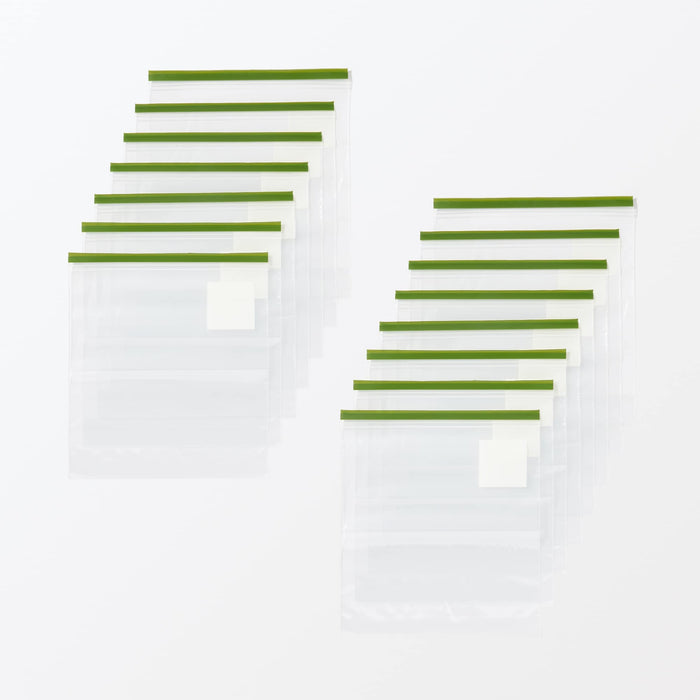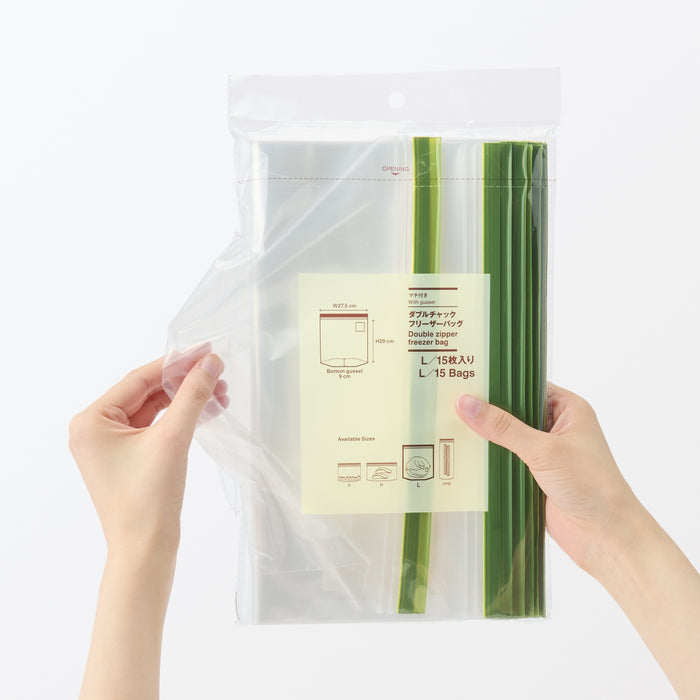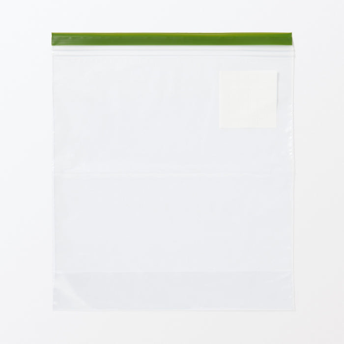 Its bottom gusset design allows the bag to stand upright for storing liquid-based foods securely. The double zipper ensures freshness with an air tight seal that prevents leakage. Each bag has a white square on the front for labelling the contents with high visibility. The packaging is designed with side and top openings for neat and convenient storage.