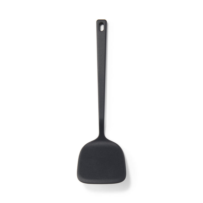 Flip and serve with ease using this versatile silicone turner. The high heat-resistant silicone surface is gentle on your cookware, preventing scratches on pots and pans while easily sliding under food. Its nylon resin core provides the necessary stability for a comfortable, secure grip. The sleek black finish is purposefully chosen to reduce visible staining from ingredients, and the material is easy to clean after use. With a heat resistance of up to 200°C, it is a reliable tool for daily frying.