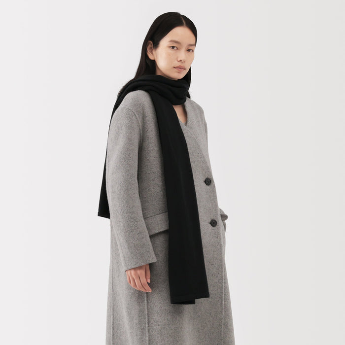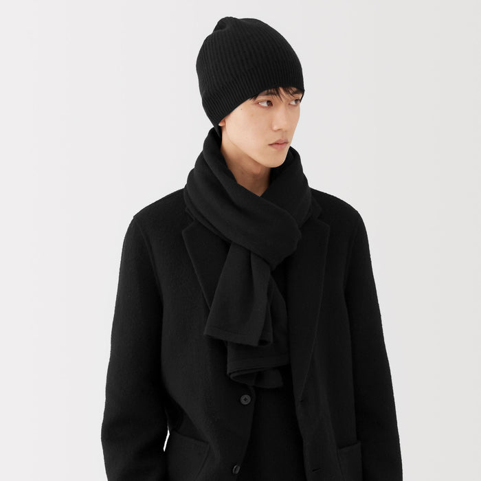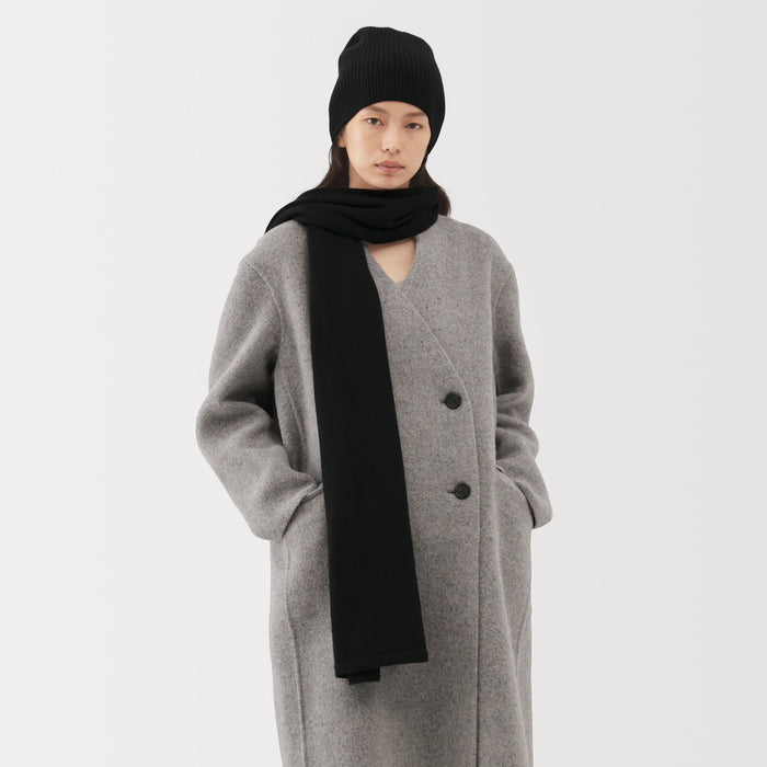 A stole knitted in a soft jersey stitch, made using downy winter hair of cashmere goats raised on the harsh cold Mongolian Plateau. The cashmere is dyed using its natural base color. Long fiber cashmere down creates a luxuriously soft and supple texture, while the large, voluminous size wraps you in a very comfortable, cozy warmth.