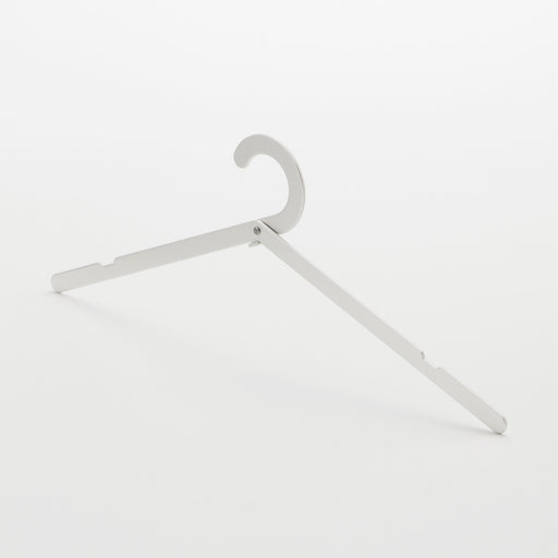 Ultra portable hanger that can be folded to a compact size when not in use to save space. Handy for carrying outwear such as a jacket while traveling.