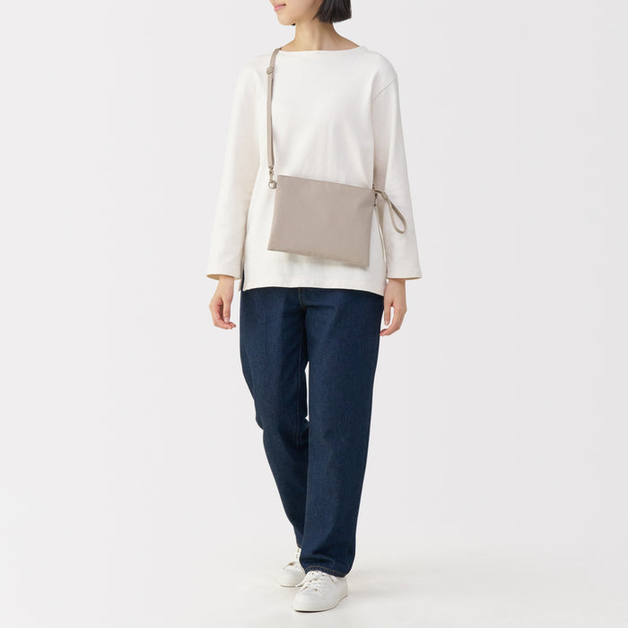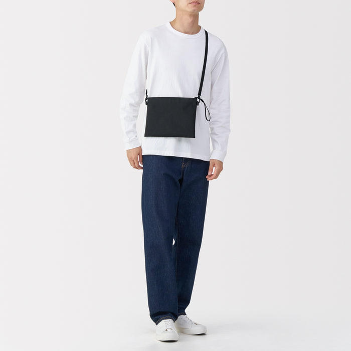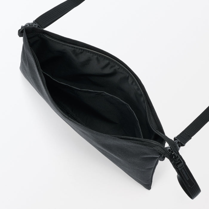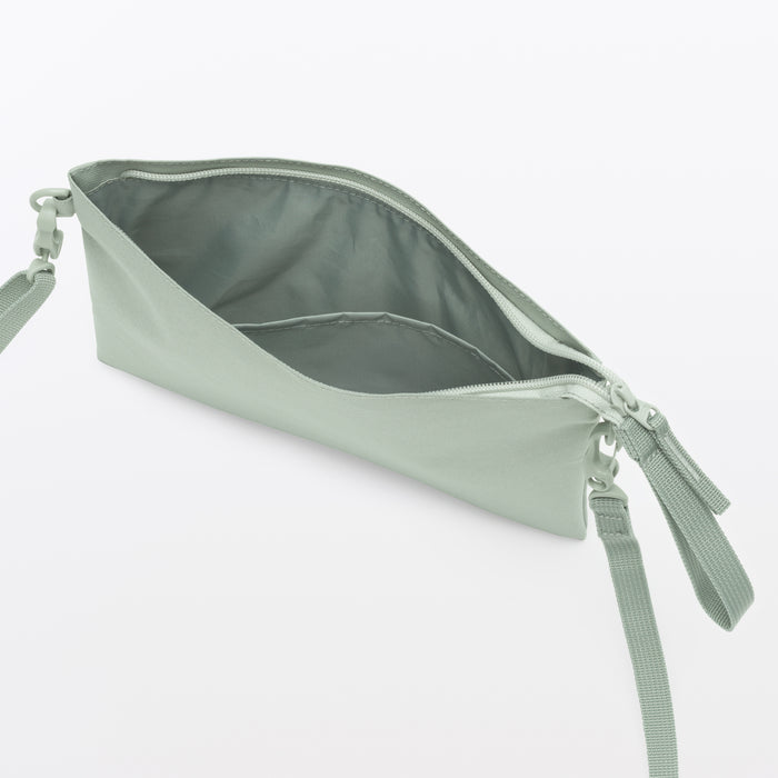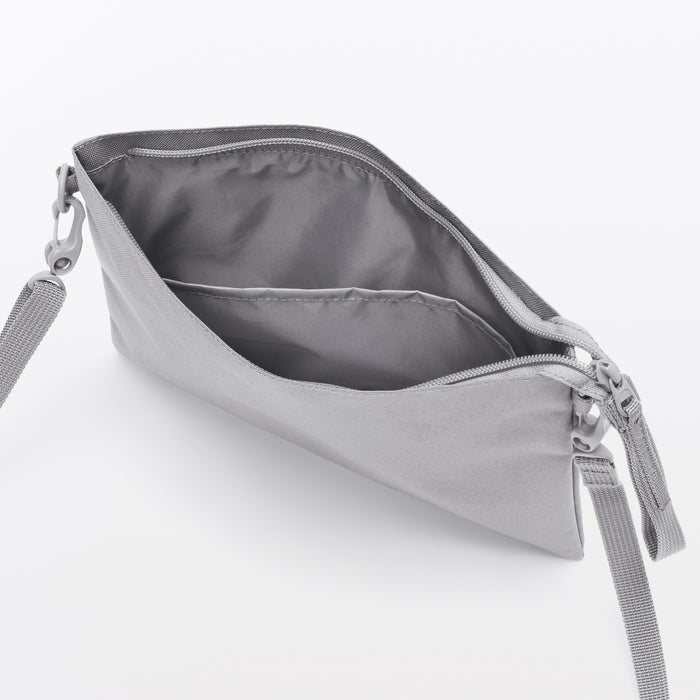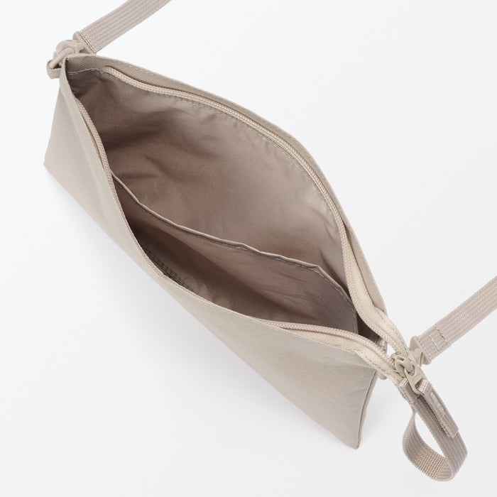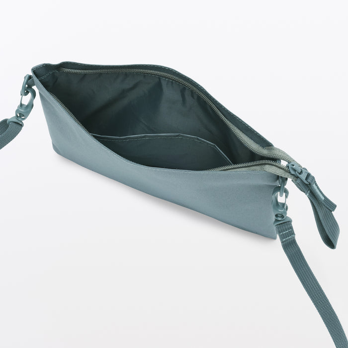 This compact, shoulder-slung pouch is the perfect size to hold all of your daily necessities for quick outings. Made from recycled polyester, it has a water repellent coating to protect your belongings. There is an interior divider to help keep its contents organized and easy to find.