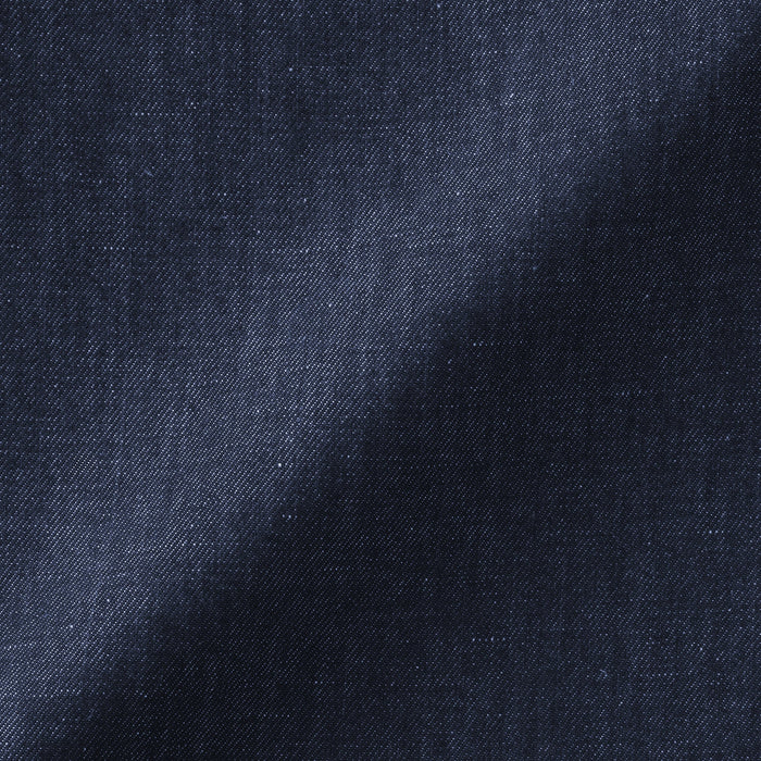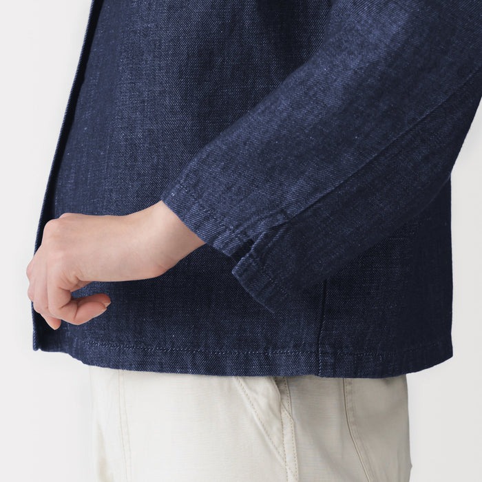 A women's button-up shirt with a boxy silhouette made with twilled hemp and organic cotton for a soft denim material that's comfortable and breezy. It has a jacket-like style, designed with 9/10 sleeves and a slightly shorter length.