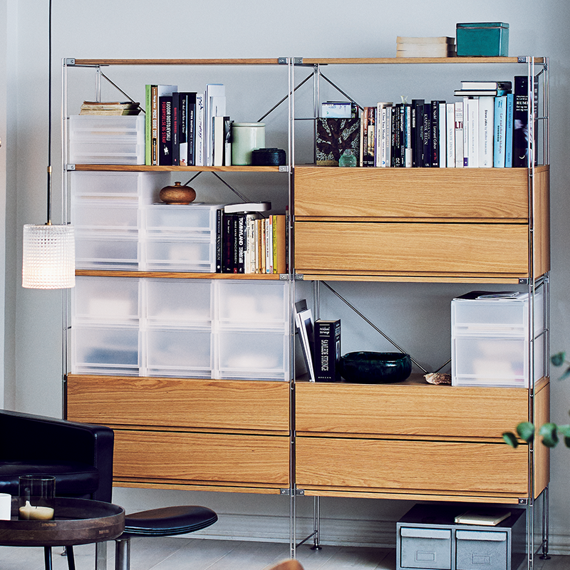 A storage case for storing small items and documents. It can be stacked and used, and the modules are combined, so it fits perfectly on a MUJI unit...