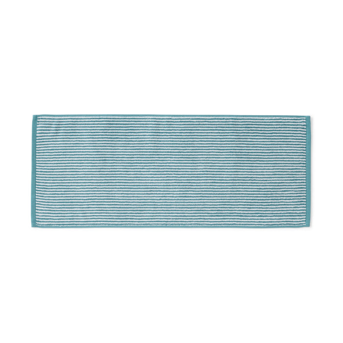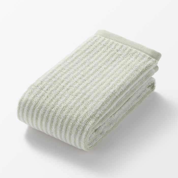 This towel's soft and fluffy pile organic cotton weave has strong absorbency, ideal for drying wet hands, washing your face or wiping off sweat. Its size is perfect for draping around your neck after showering, or after exercising. There is a loop in the corner that lets you hang it easily.