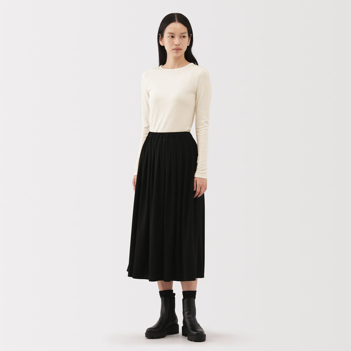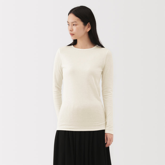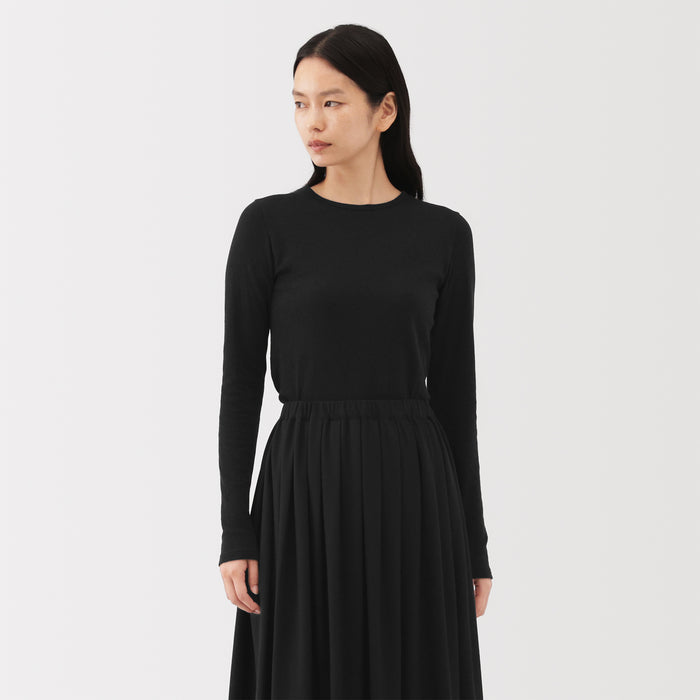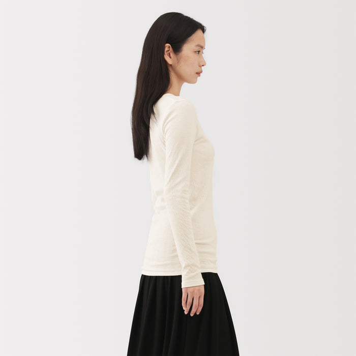 A comfortable undershirt made of jersey material that combines the suppleness and durability of extra-long staple cotton with the smoothness of cashmere to create a soft and smooth texture. The cashmere blend allows for moderate elasticity and stretch, and it's just the right thickness for either wearing on its own or layered underneath a sweater or jacket.