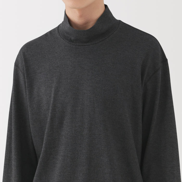 A men's jersey t-shirt featuring a high neck that is just the right height to avoid discomfort around the throat. Its relaxed silhouette is perfectly comfortable to wear both when going out or lounging at home. The fabric blend includes wool for a soft, warm feeling.