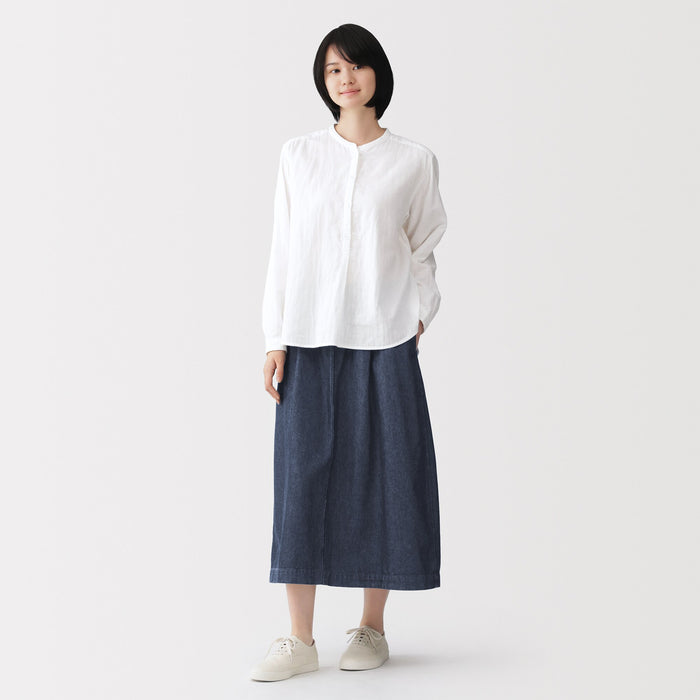 This midi skirt is made with 100% cotton denim for a material that is soft and lightweight, making it perfect for spring to early autumn. The waistband is elastic with a drawstring on the inside for a comfortable and adjustable fit. It is a casual piece that is calf-length and finished with a subtle cocoon silhouette, so it can easily be coordinated with a variety of outfits.