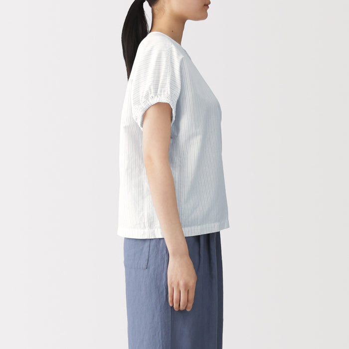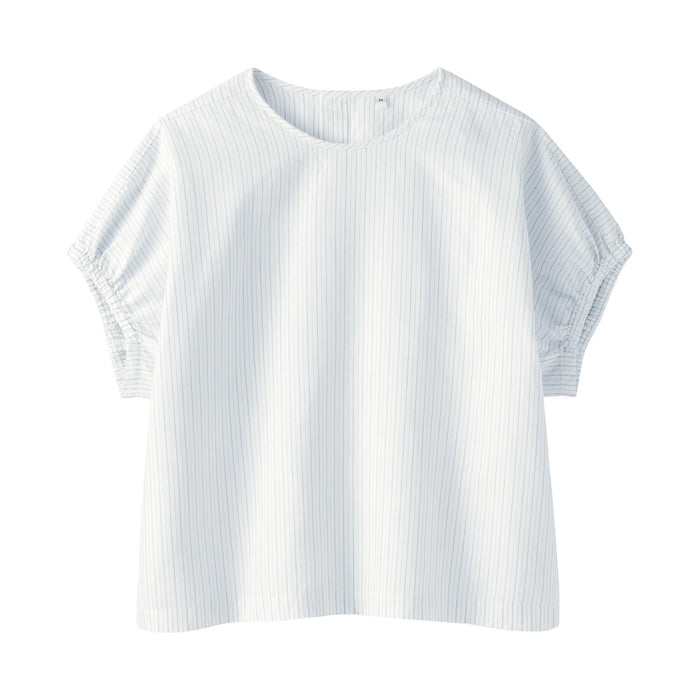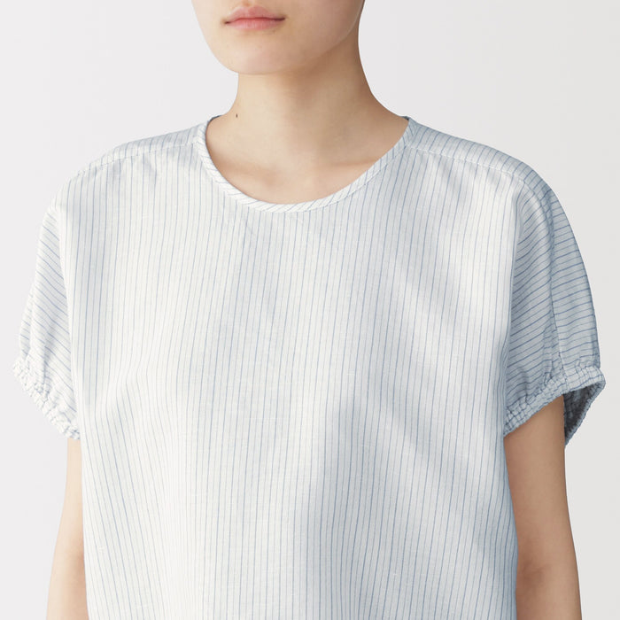 A women's short sleeve blouse with a boxy fit made with cooling hemp and organic cotton for a soft, fluffy material that's comfortable, breezy, and perfect for warmer weather. The gathering on the sleeves adds a feminine touch and gives it a rounded silhouette.