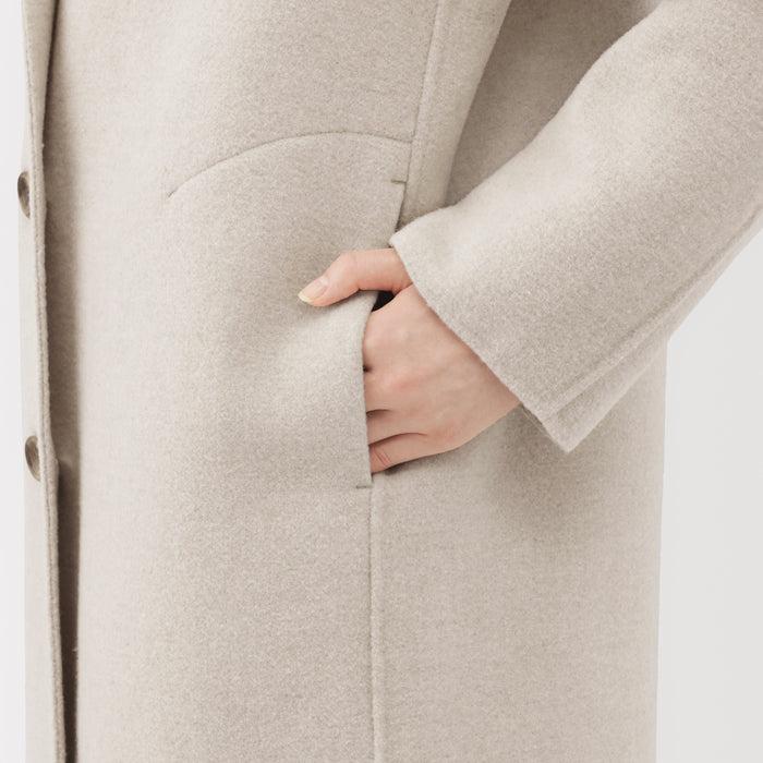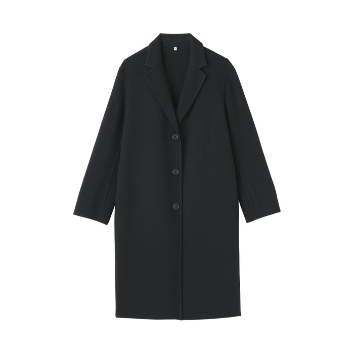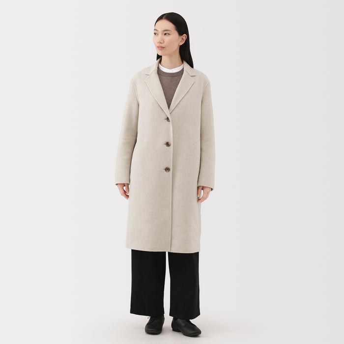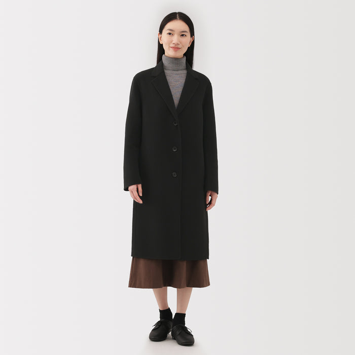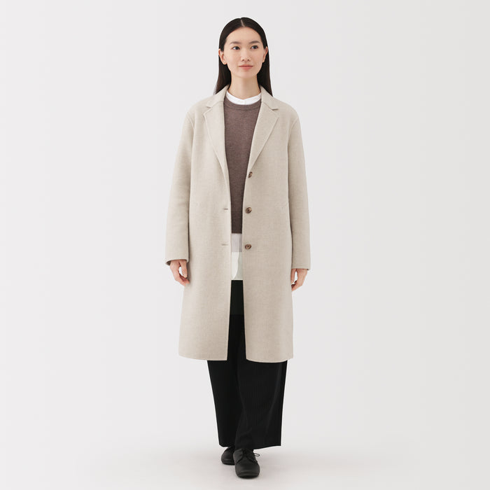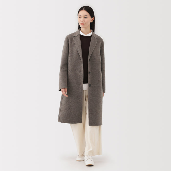 This elegant Chester coat is made with a plump wool-blend fabric that will keep you warm in colder seasons. It has a double-faced finish with brushed fabric on both sides, giving it a warm, soft texture and making it lighter to wear than conventional recycled wool coats. The Chester coat style allows for a wide range of styles, from smart to casual.