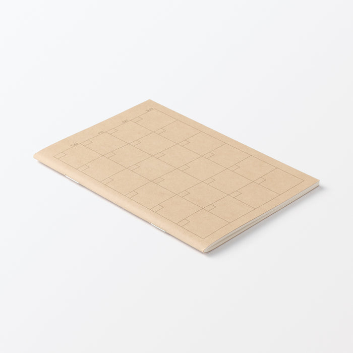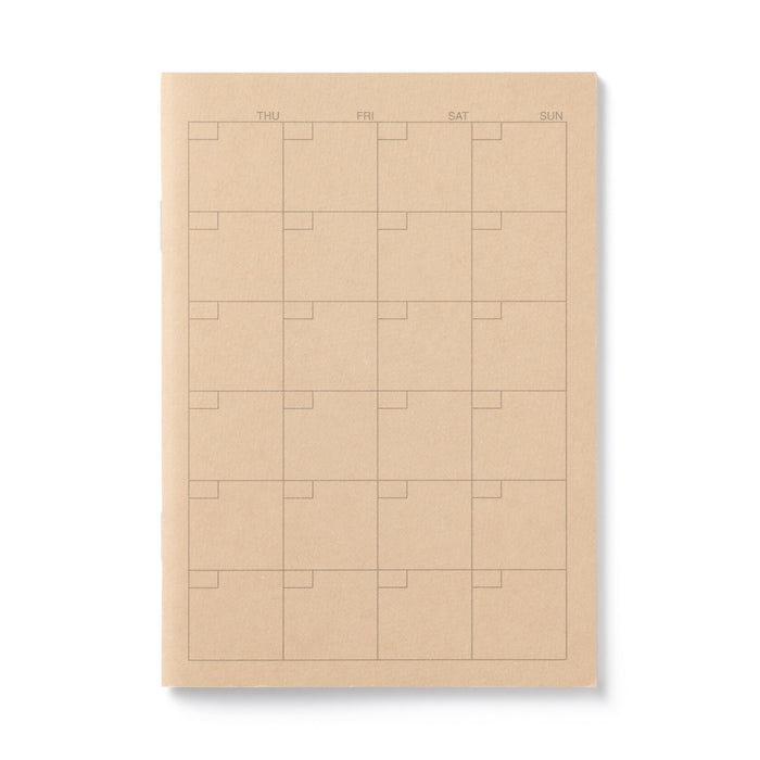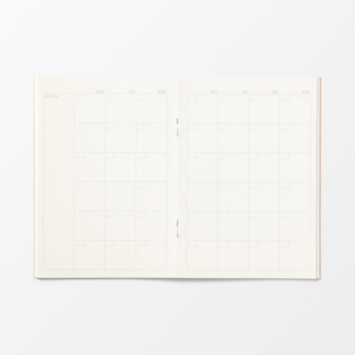 Organize your schedule with ease using this compact A6 monthly planner. This free-style schedule book features an undated monthly view, allowing you to fill in the dates yourself and begin planning at any time of the year. The interior pages are crafted from at least 55% recycled paper, which provides a natural texture and may include small dark spots unique to recycled materials. Its portable size makes it a perfect companion for keeping your monthly goals and appointments within reach while you are on the go.
