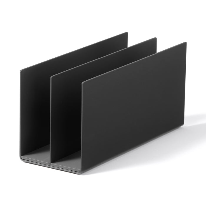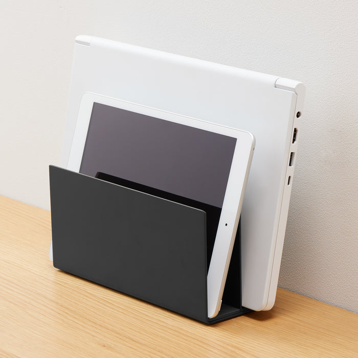 A partition stand for organizing your desk, made from sturdy steel plates. Heavy enough to remain stable, you can use it to hold books or electronic devices without worrying about it falling over from the weight. Includes silicone resin to attach on the tops to protect from scratches.