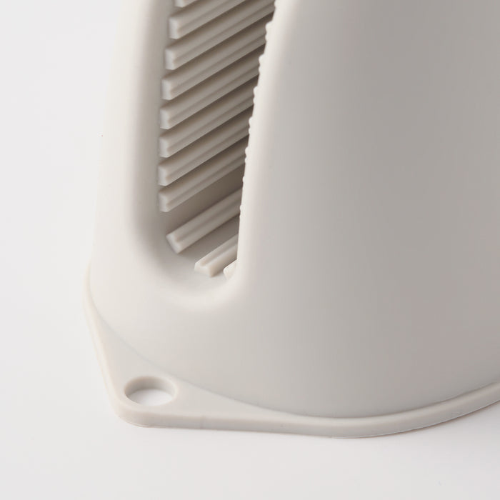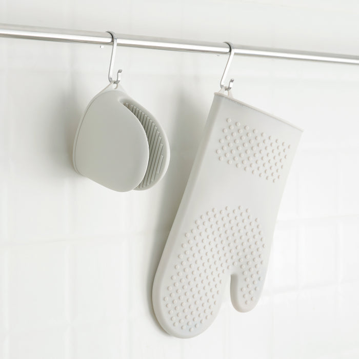 A protective mini oven mitt designed to keep your hands safe while handling hot cookware and bakeware in the kitchen. Made of food-grade soft silicone that is comfortable to wear, with anti-slip texture designs for easy gripping. Hanging storage holes save space when not in use.
