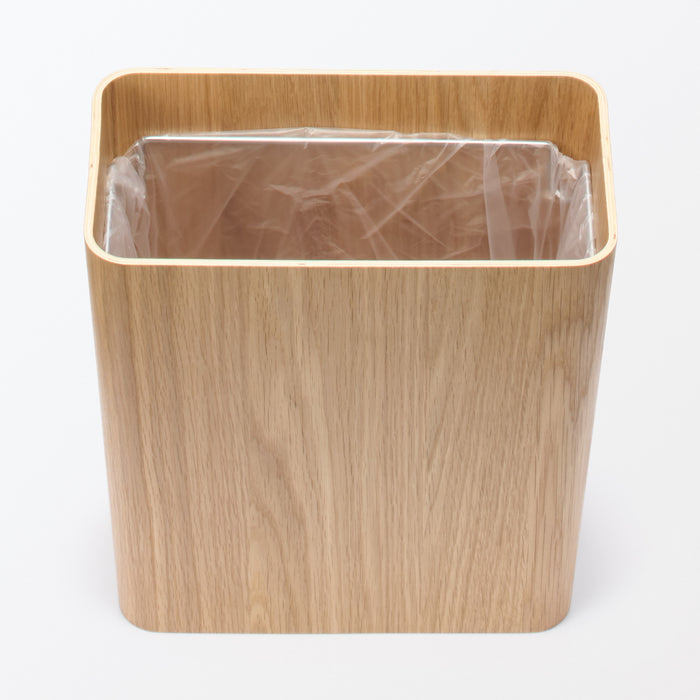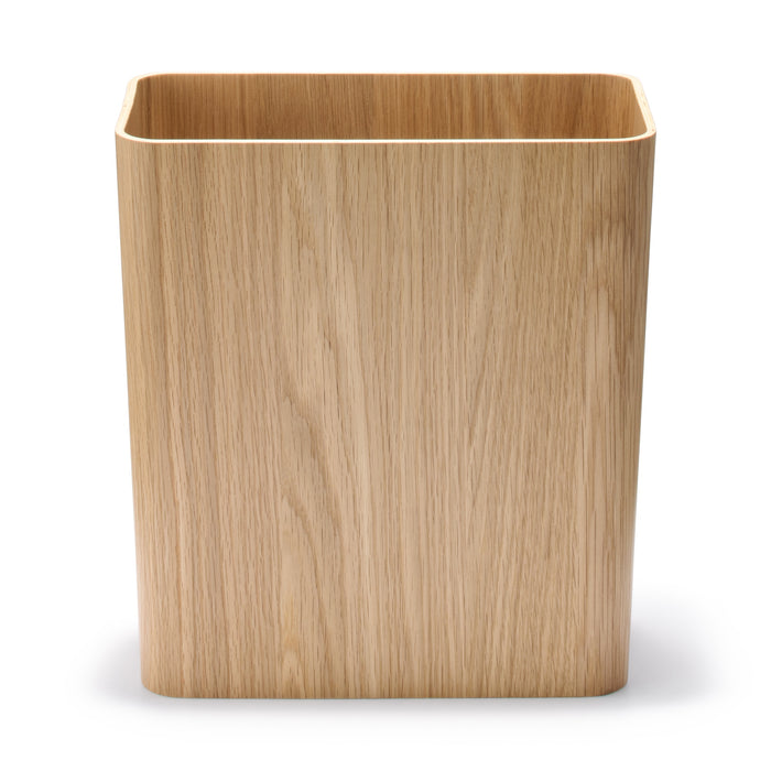 A simple space-saving dust bin made from natural wood laminated fibreboard with oak veneer and plywood. A wire frame is included inside to keep plastic bags in place.
