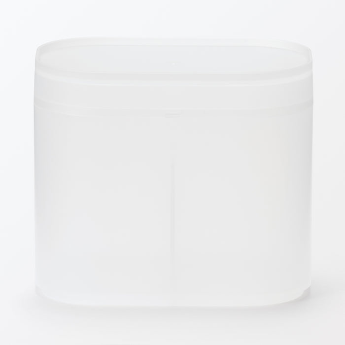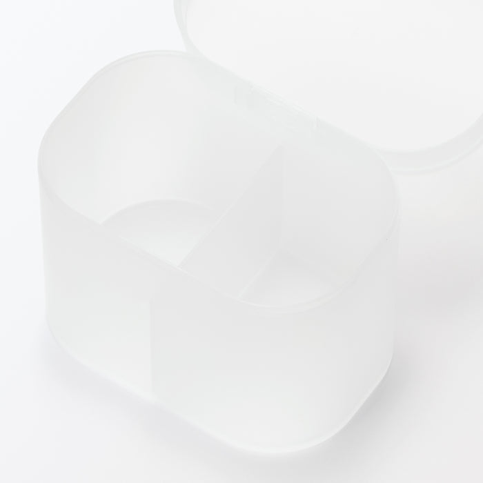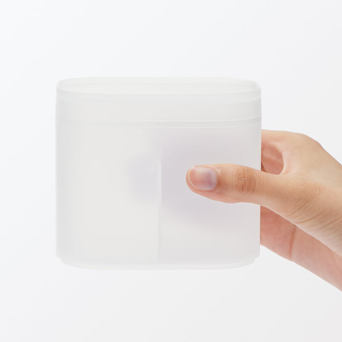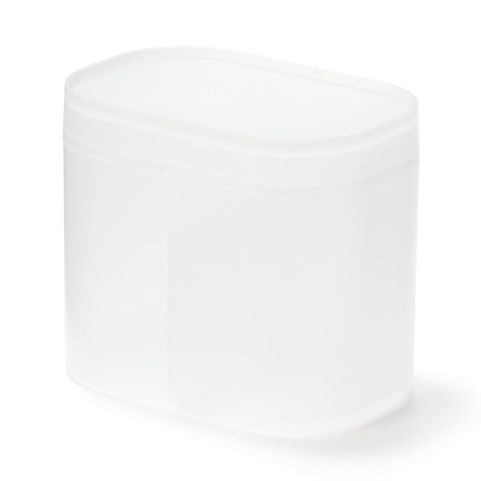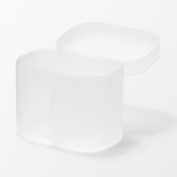 A makeup box made from partially recycled polypropylene that is sturdy and easy to clean. The translucent material also allows you to quickly see the contents inside, without adding too much visual clutter. The perfect size for neatly storing cotton pads and swabs, as well as cosmetics or other small items.