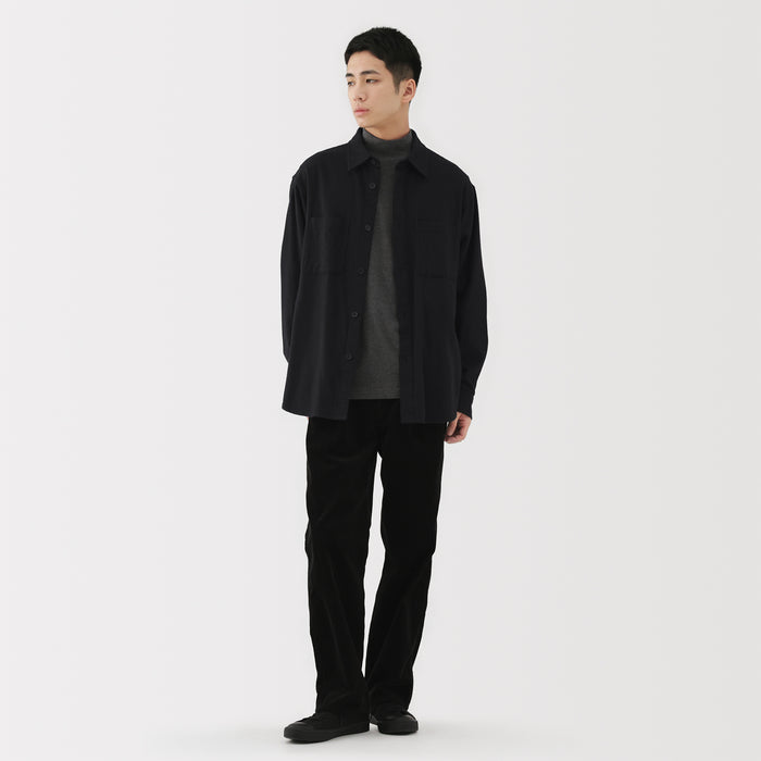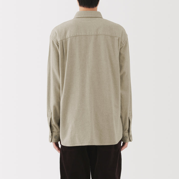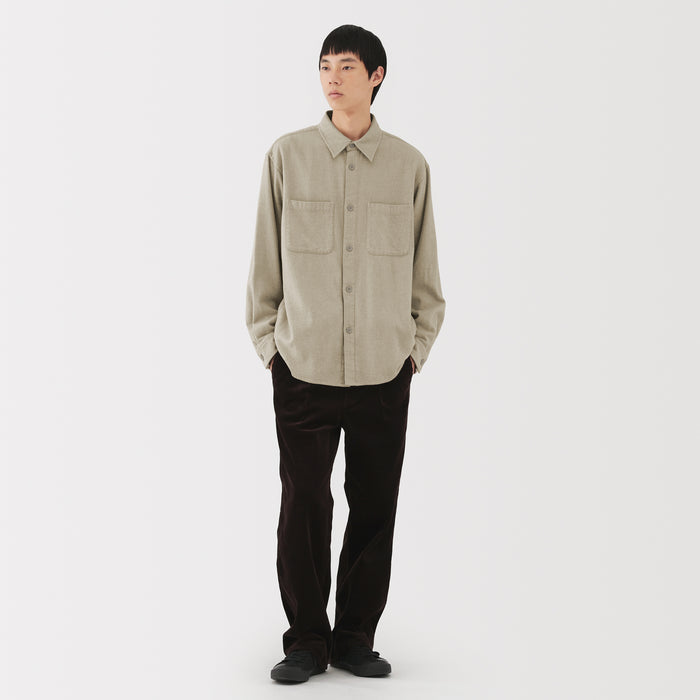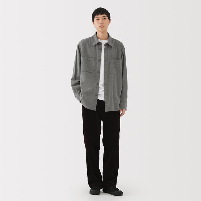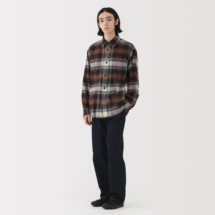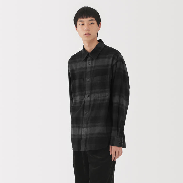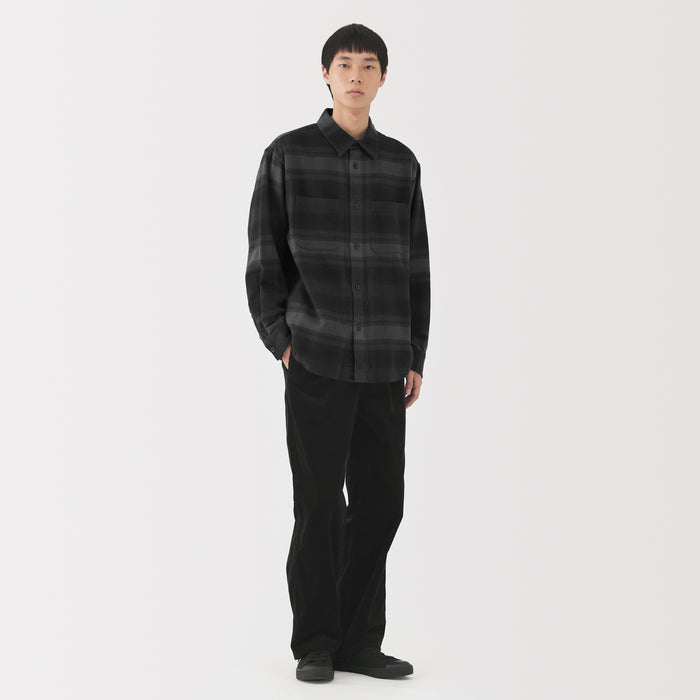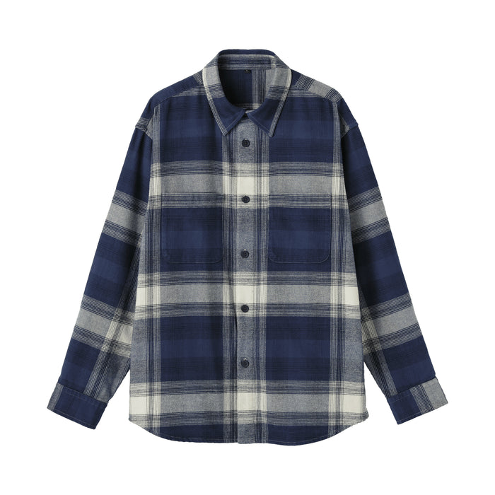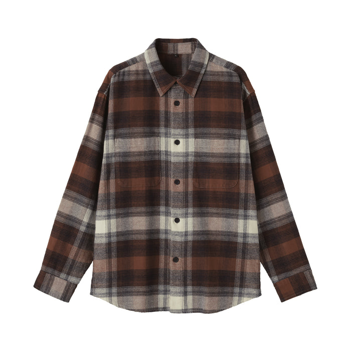 A cozy men's flannel shirt jacket that you'll want to wear during the fall and winter months. The special brushing process on both sides of the fabric gives it a unique soft and smooth texture that will keep you warm and comfortable. It has a relaxed silhouette that can be suitable for a unisex style.
