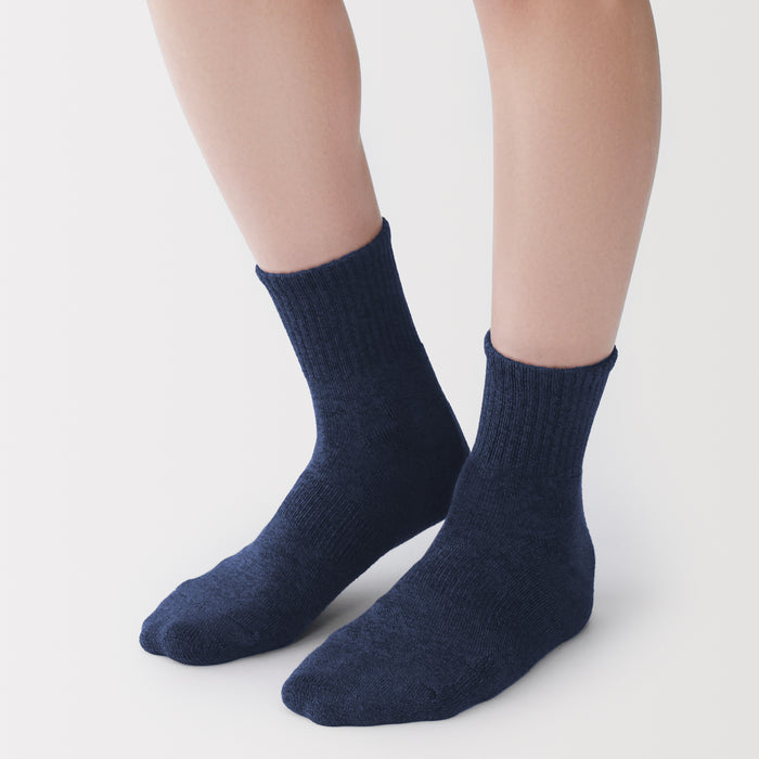 Soft pile-knitted sole with a sweat de-odorizing effect. The heel of the socks is knitted at a right angle to wrap comfortably and naturally around the heel.