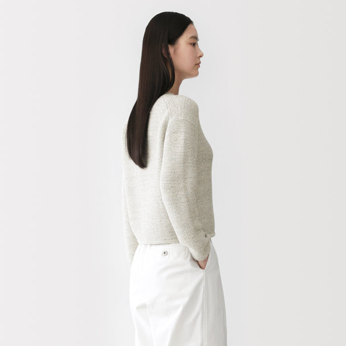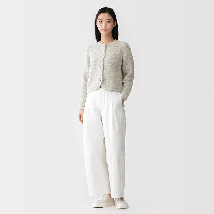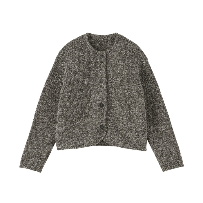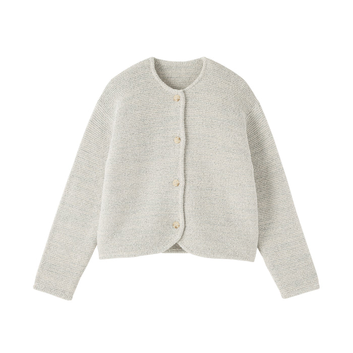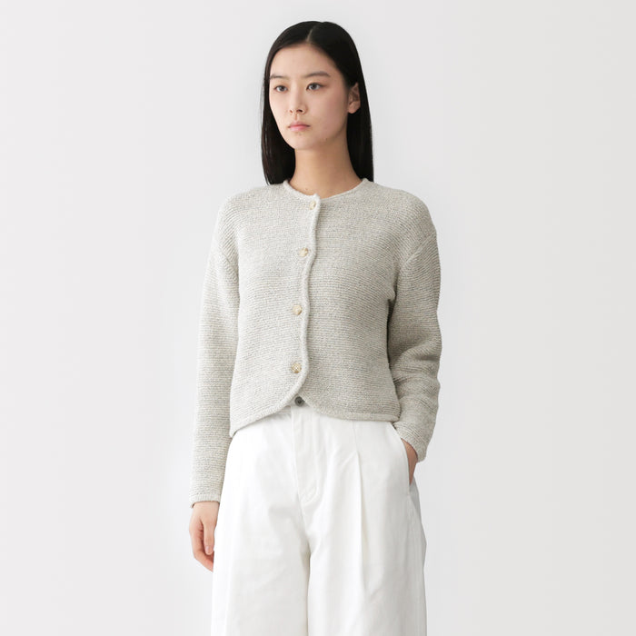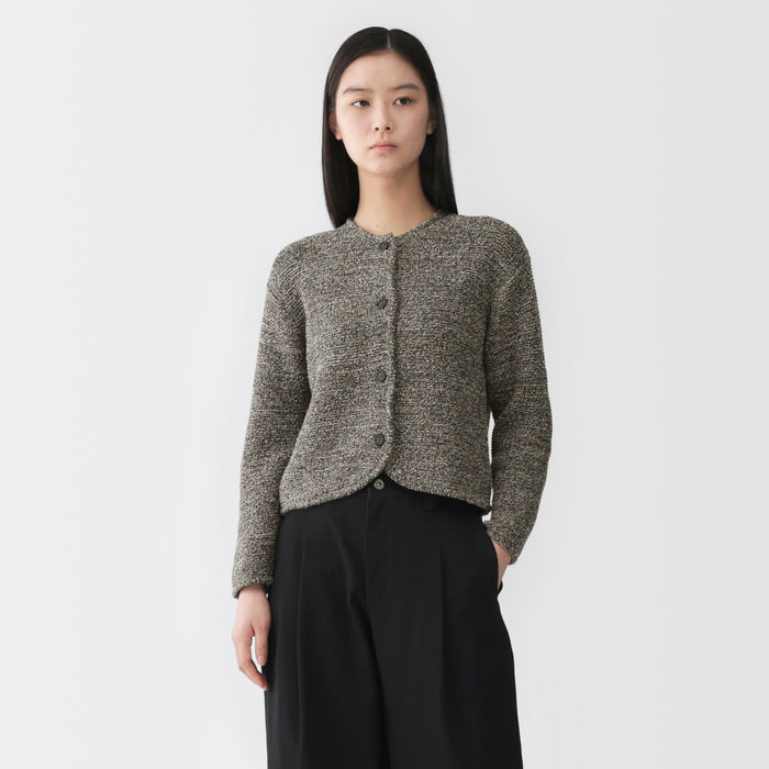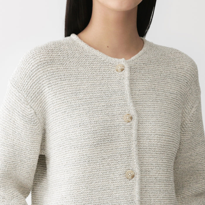 Une veste en maille pour femme luxueusement douce qui utilise à la fois un mélange de coton bouclé et du fil Kabe pour un aspect unique et une texture confortable.