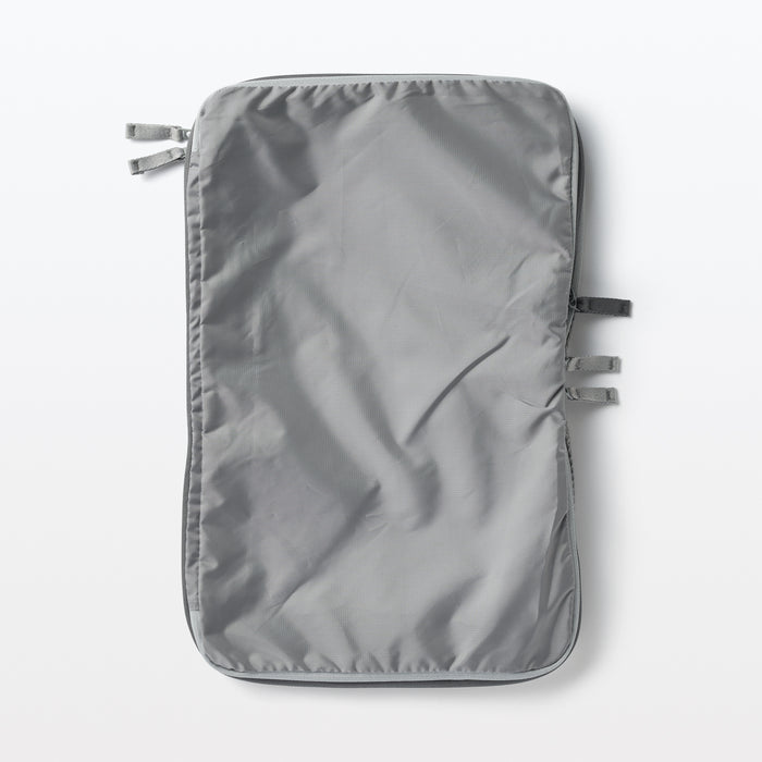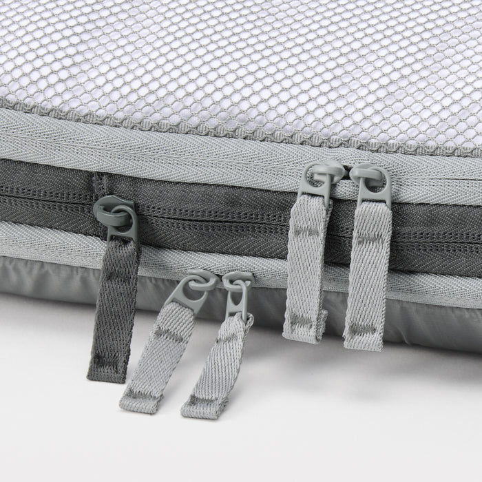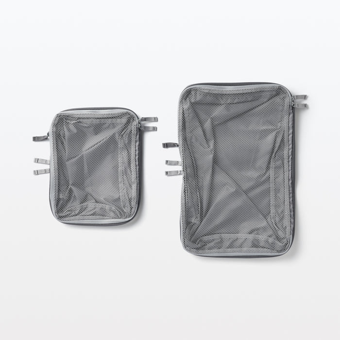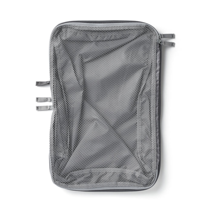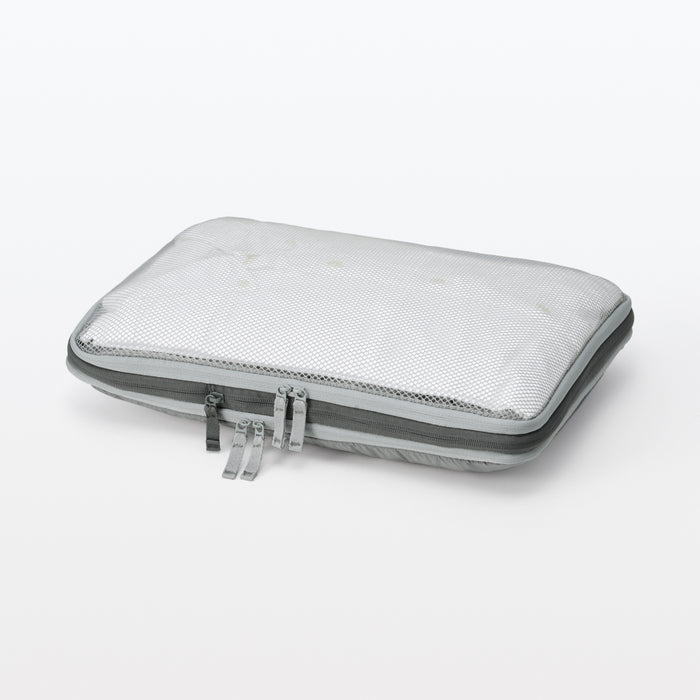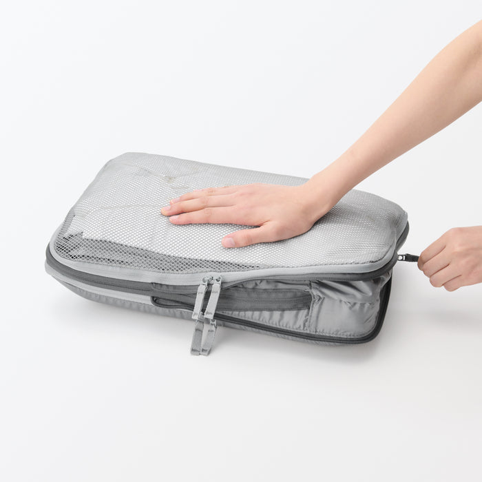 A travel case made from a durable and lightweight mesh fabric. Simply close the zipper in the middle to compress its contents for more efficient packing and reducing overall bulk. The mesh on one side allows you to easily preview the contents, making it great for organizing clothing inside of suitcases for travel.