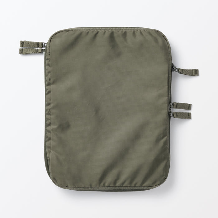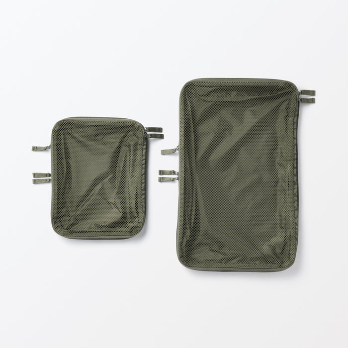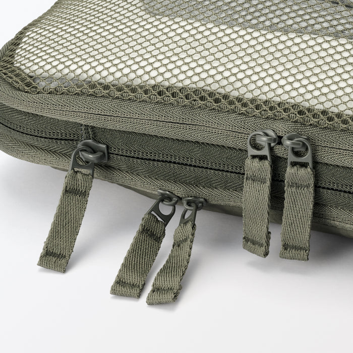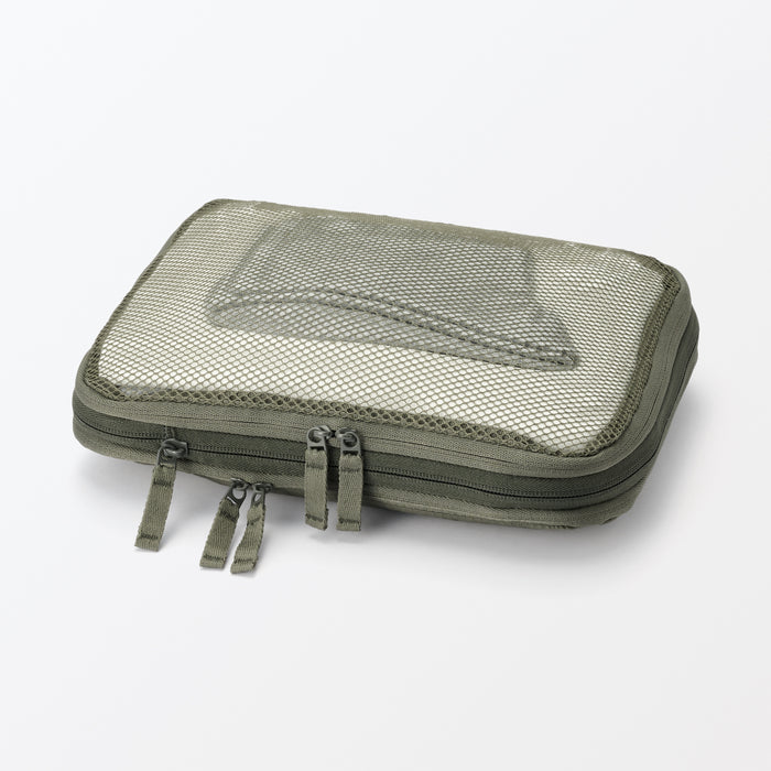 A travel case made from a durable and lightweight mesh fabric. Simply close the zipper in the middle to compress its contents for more efficient packing and reducing overall bulk. The mesh on one side allows you to easily preview the contents, making it great for organizing clothing inside of suitcases for travel.