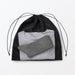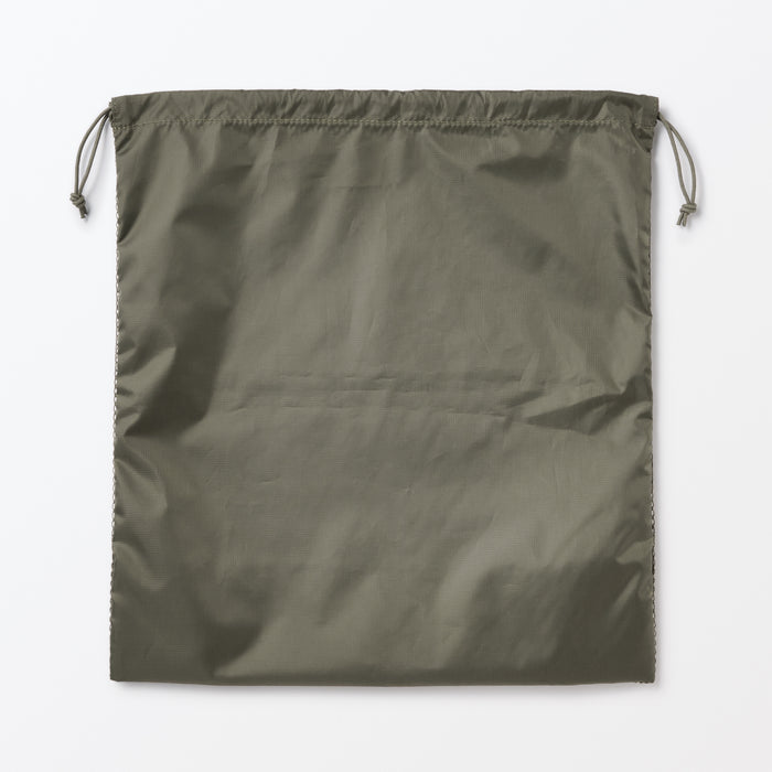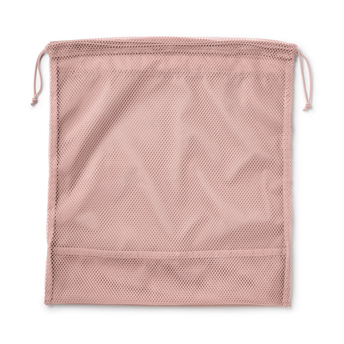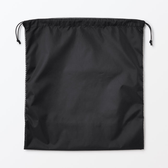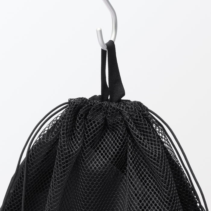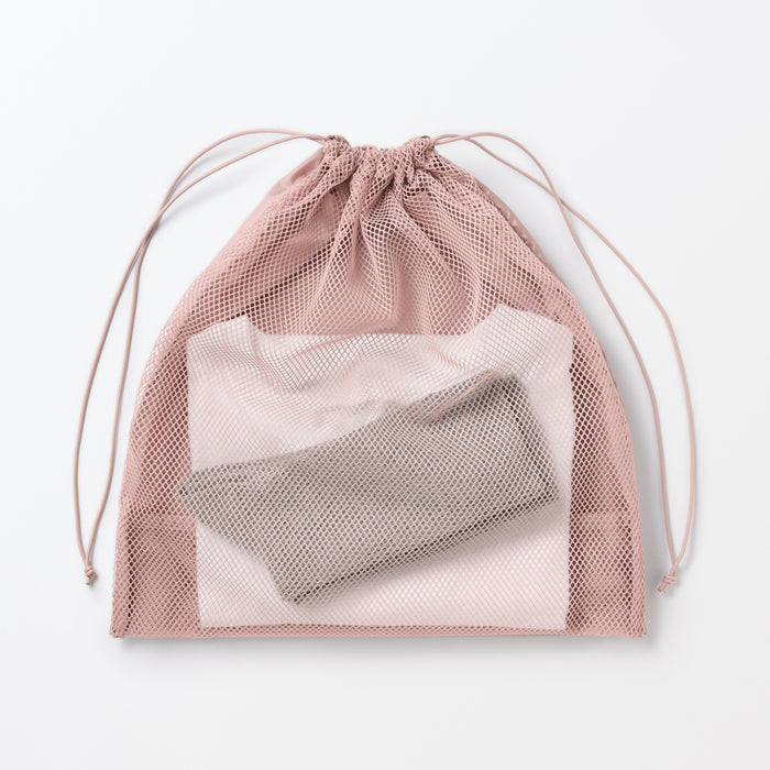 A double-layer mesh drawstring bag with an internal divider that's perfect for travelling. You can store items meant to be visible in the mesh layer, and those intended to remain hidden in the fabric-enclosed side. The attached loop can be used as a carrying handle, and it can also hang conveniently on hooks in places like airplanes or hotels.