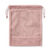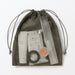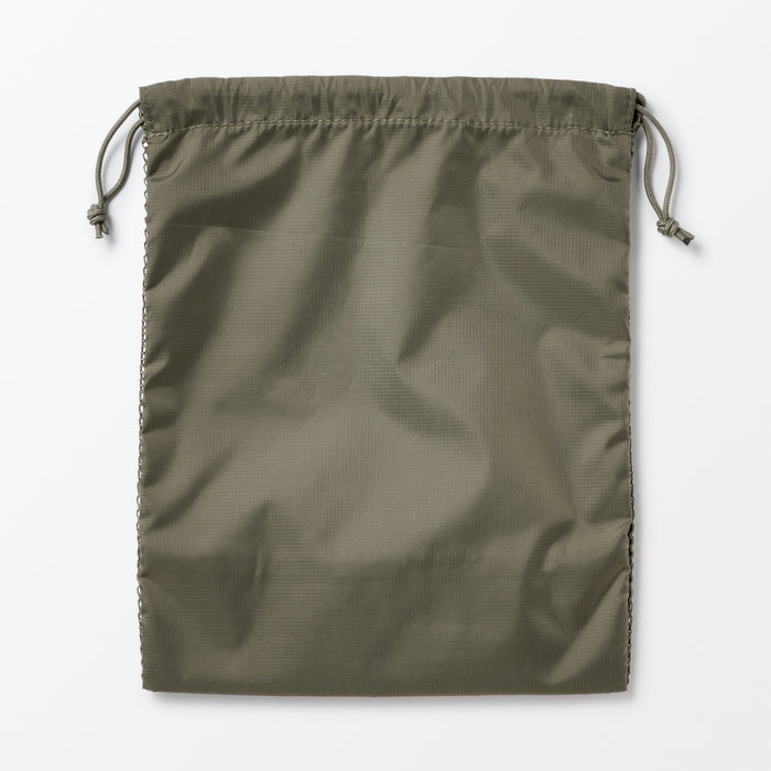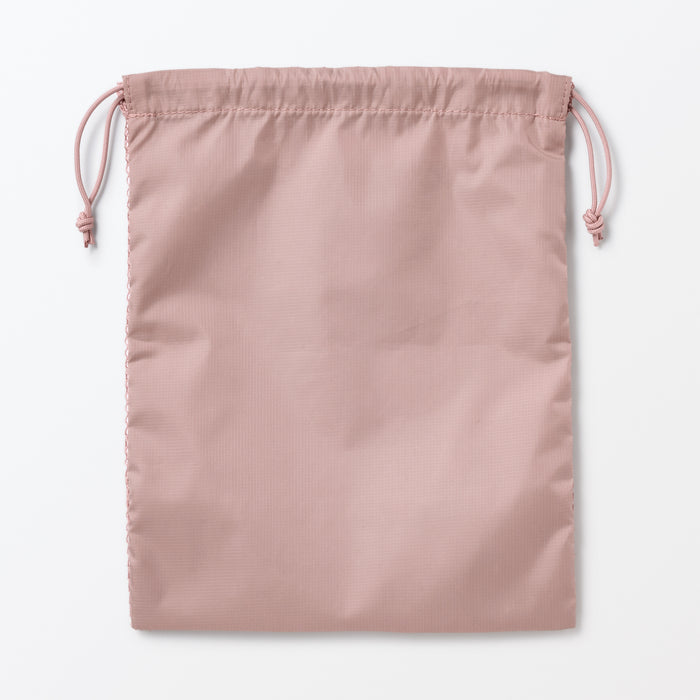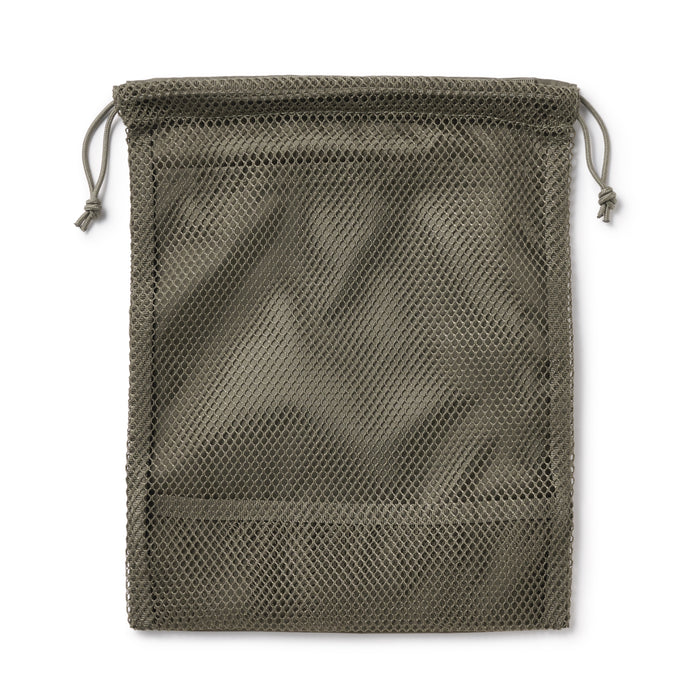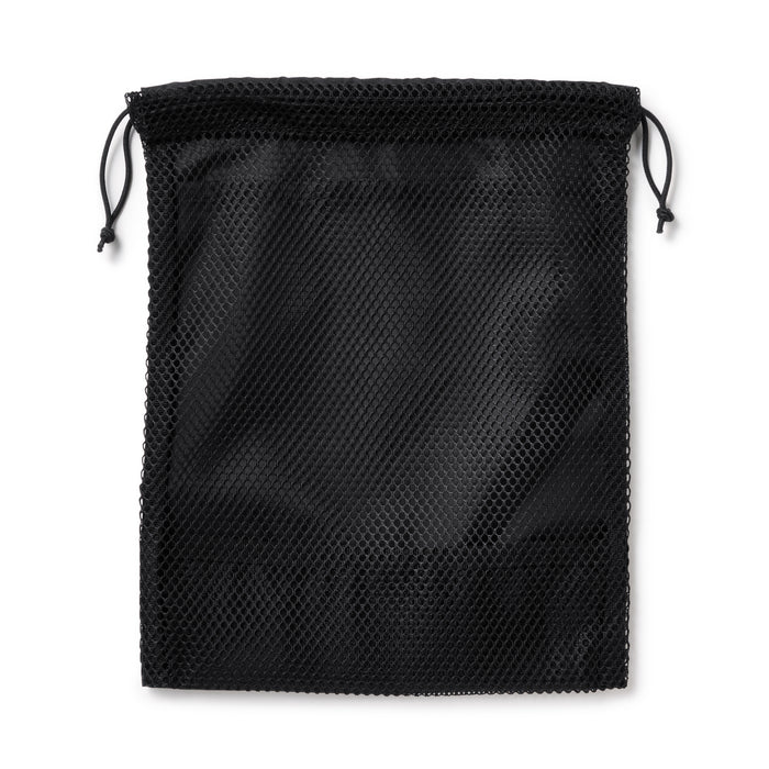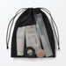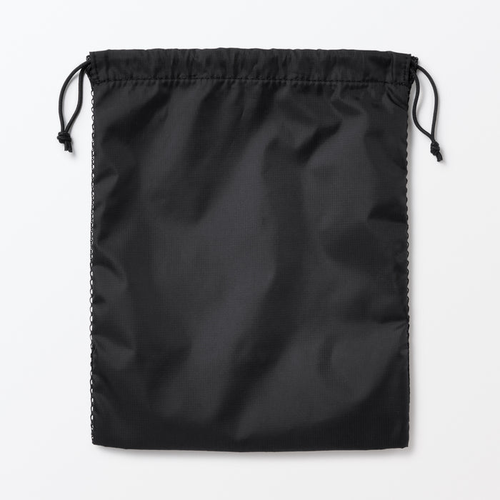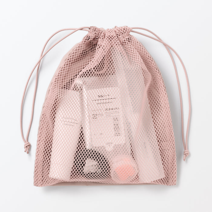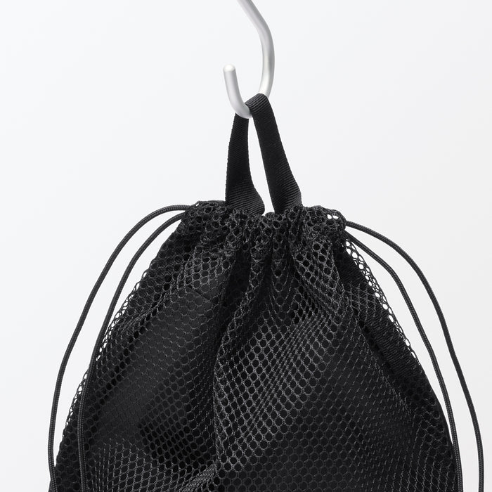 A double-layer mesh drawstring bag with an internal divider that's perfect for travelling. You store items meant to be visible in the mesh layer, and those intended to remain hidden in the fabric-enclosed side. The attached loop can be used as a carrying handle, and it can also hang conveniently on hooks in places like airplanes or hotels.