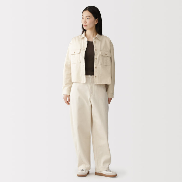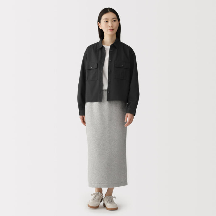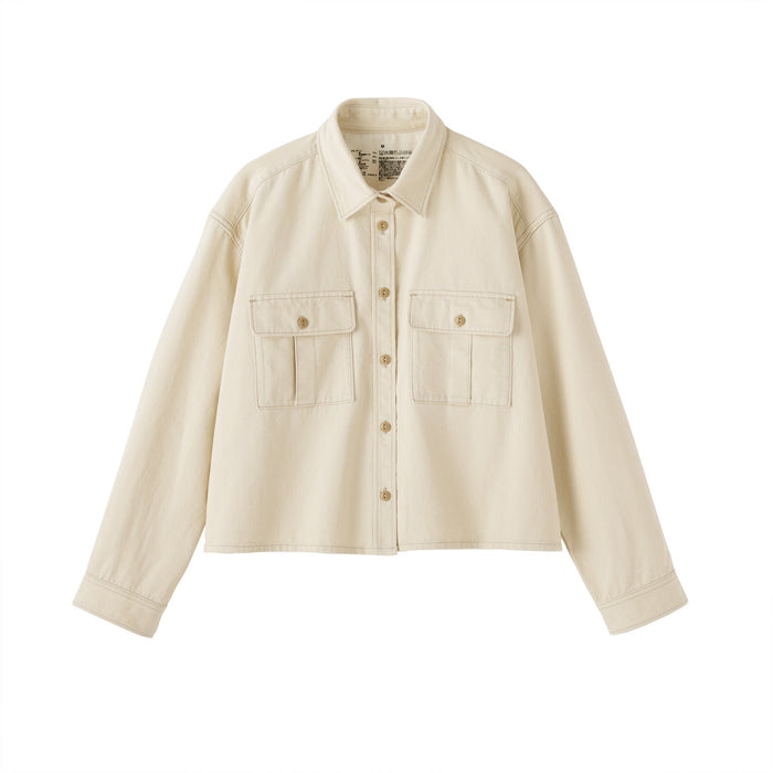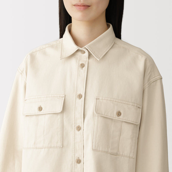 A women's twill long sleeve shirt with a soft, airy texture and lightweight feel. It has a slightly cropped length for a boxy silhouette that pairs well with high-waisted bottoms.