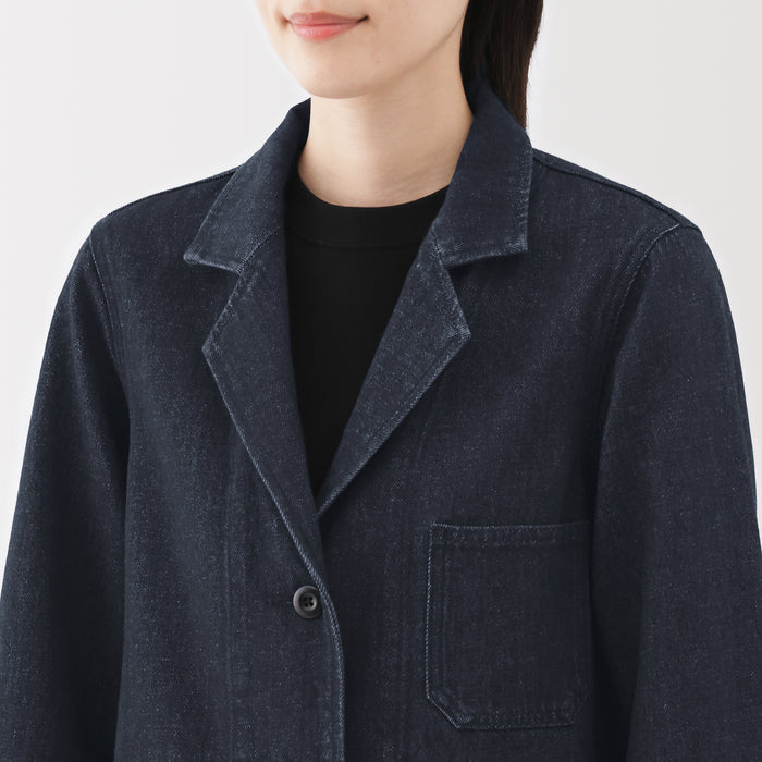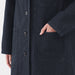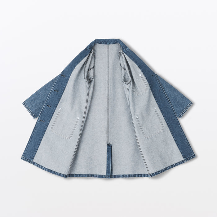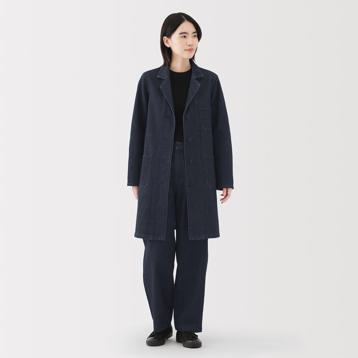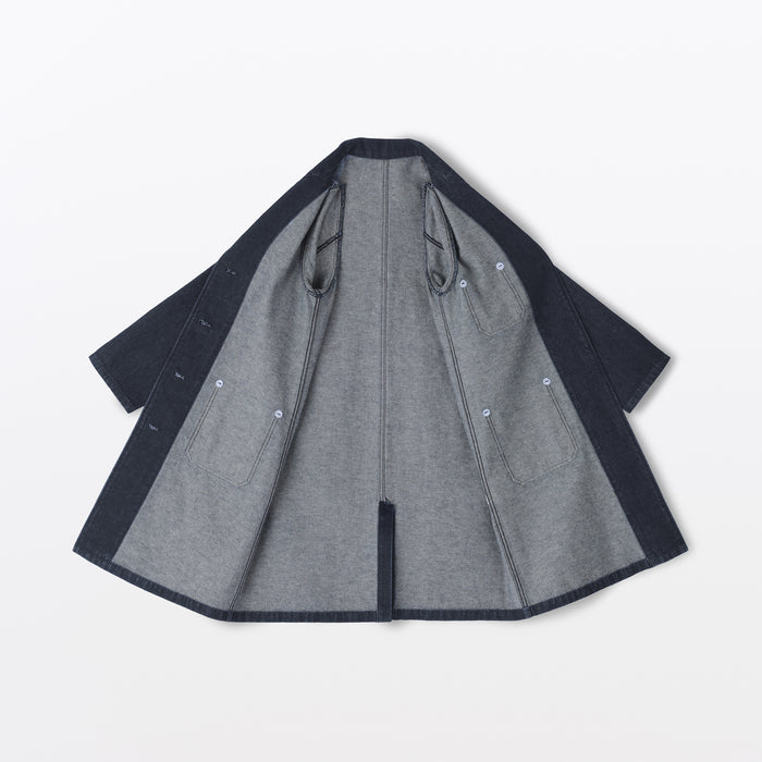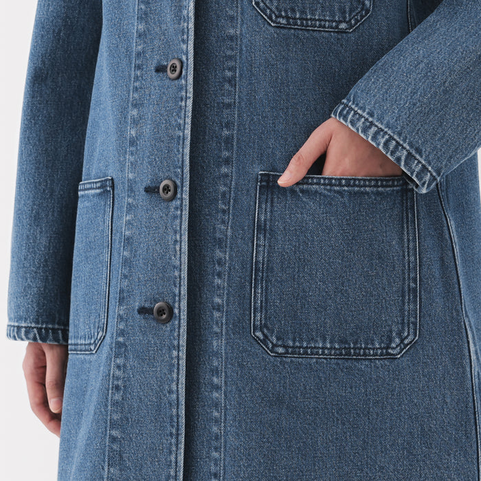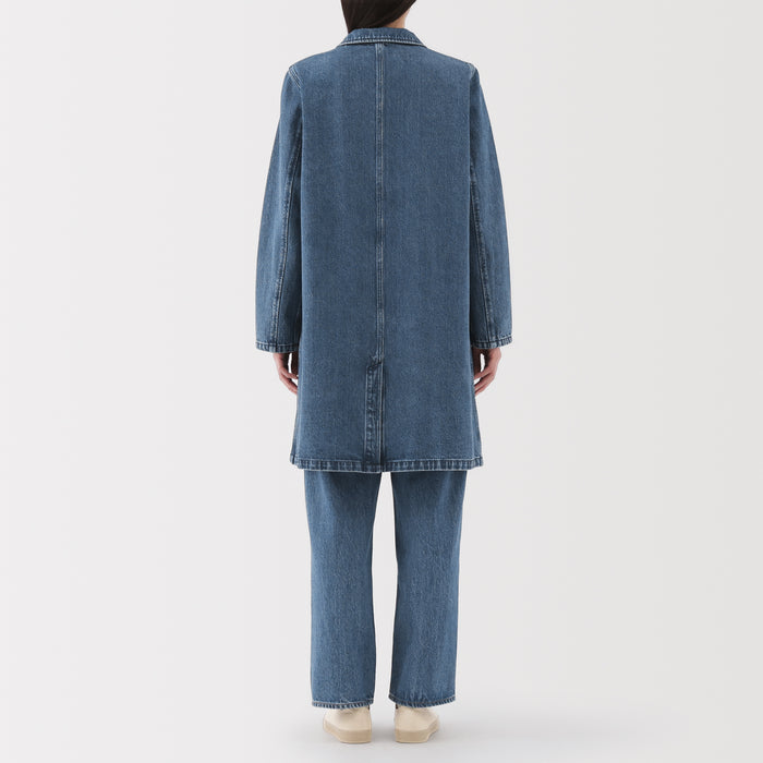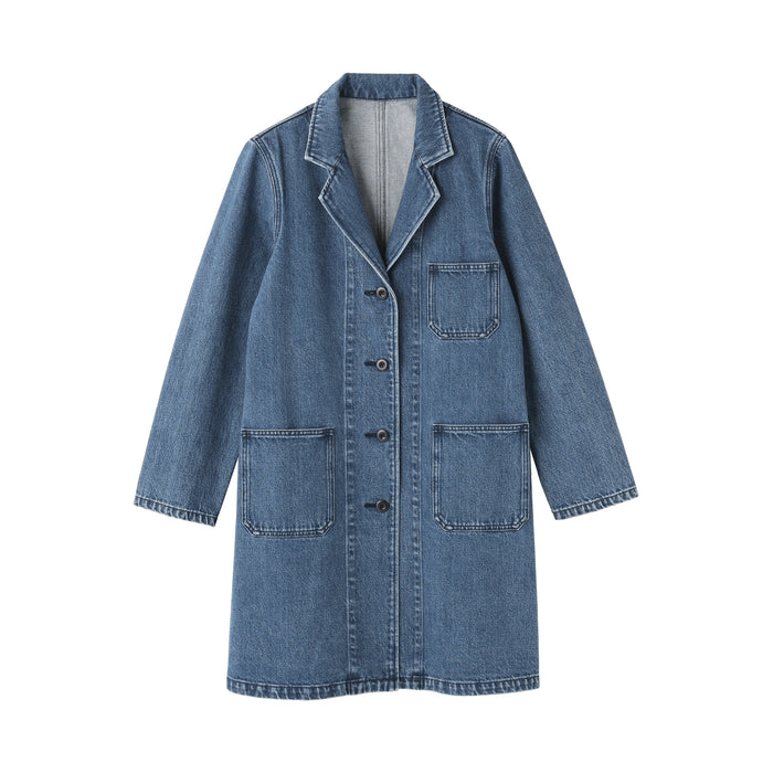 This sleek long coat is made from a sturdy yet lightweight denim fabric, providing the perfect balance of warmth and style. It has just the right thickness for daily spring and fall wear, and it can layer comfortably over a hoodie or sweatshirt for cooler days, making it a practical and versatile piece. By using a fabric that mixes kapok with organic cotton, it is softer and lighter than conventional 100% cotton.