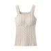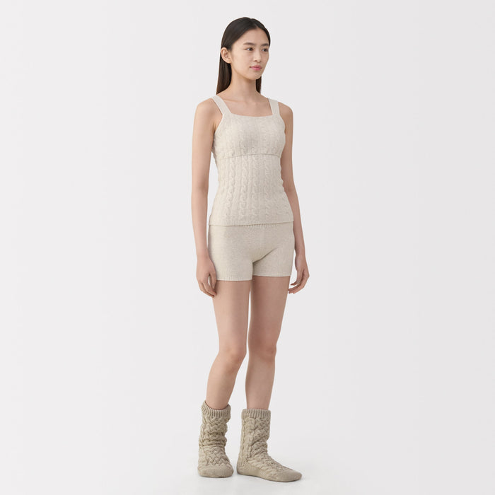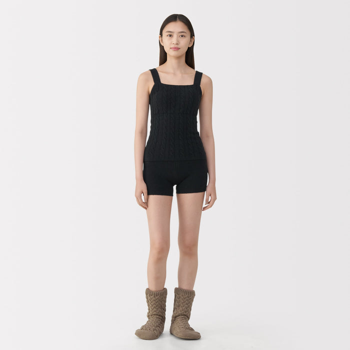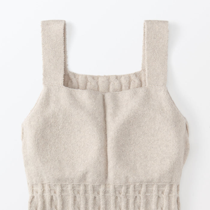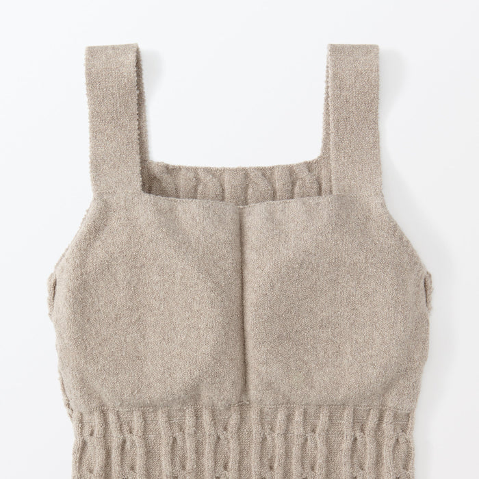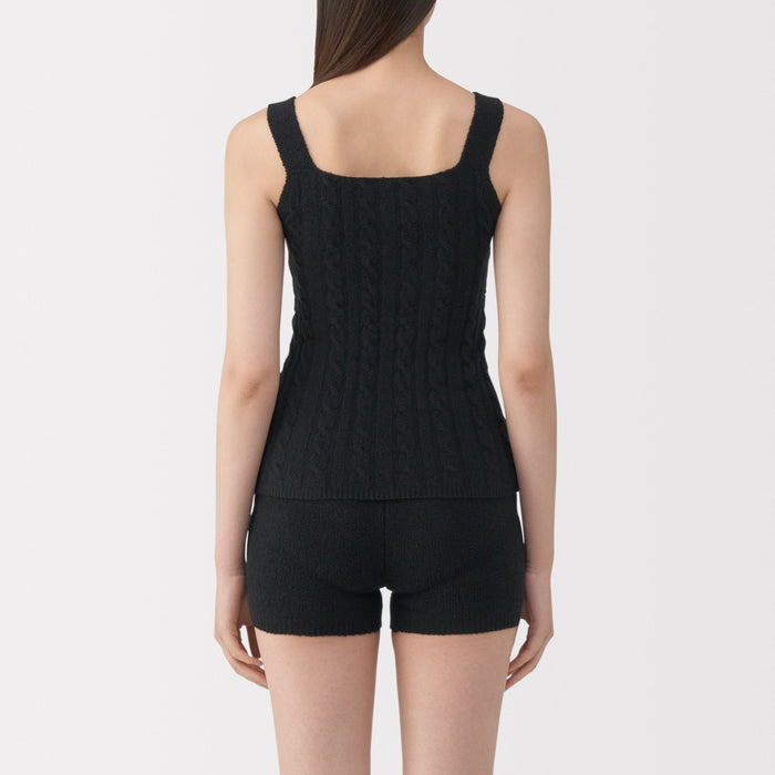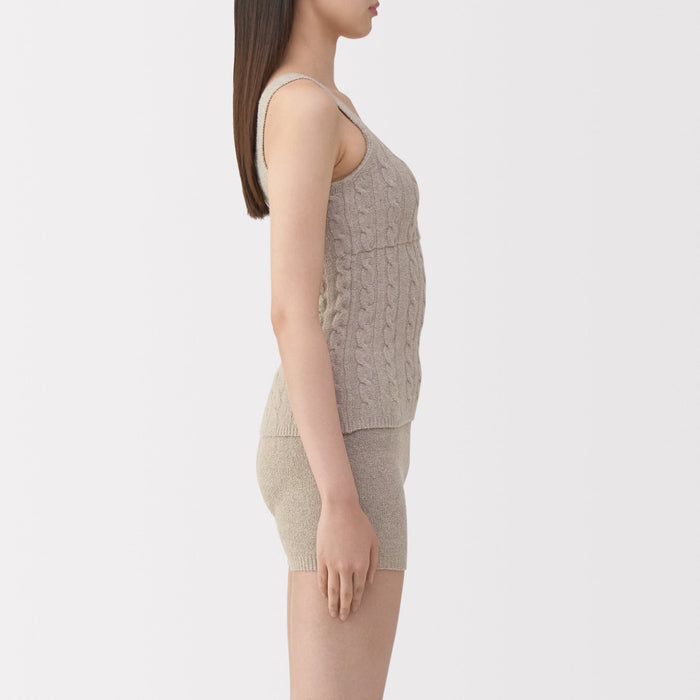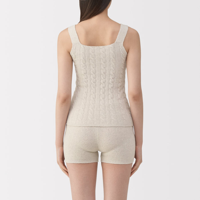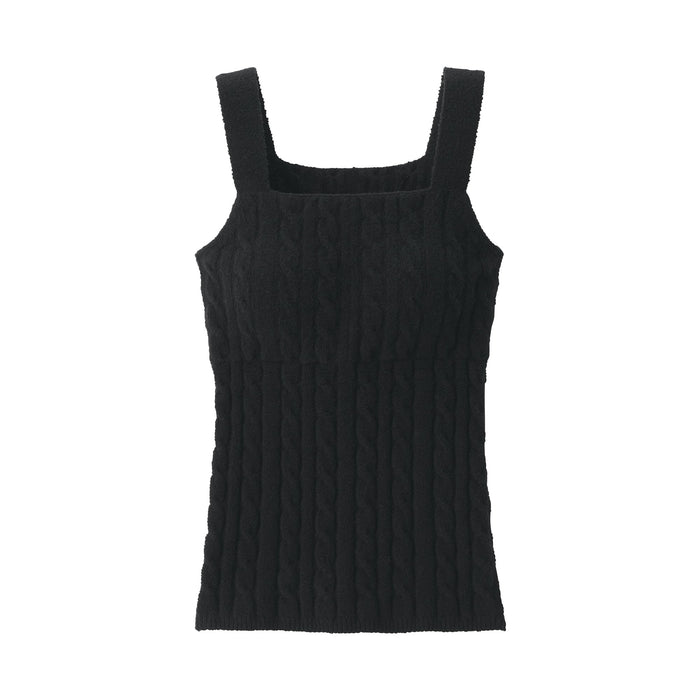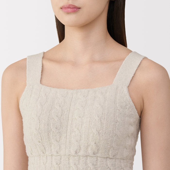 This tank top is designed with removable bra cups for easy washing. It is made from organic cotton-covered threads in a cable knit pattern, offering both elasticity and a luxuriously soft, fluffy feel. The wide straps ensure a comfortable fit without digging into your shoulders.