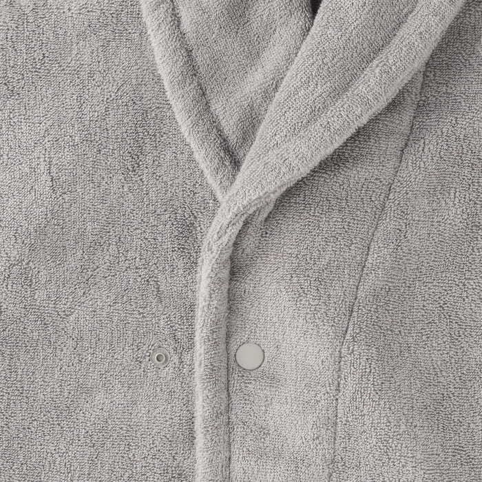 This bathrobe features a twin pile cotton weave that creates a soft, fluffy texture. Its seamless sides ensure added comfort, and the buttons allow for easy fastening.