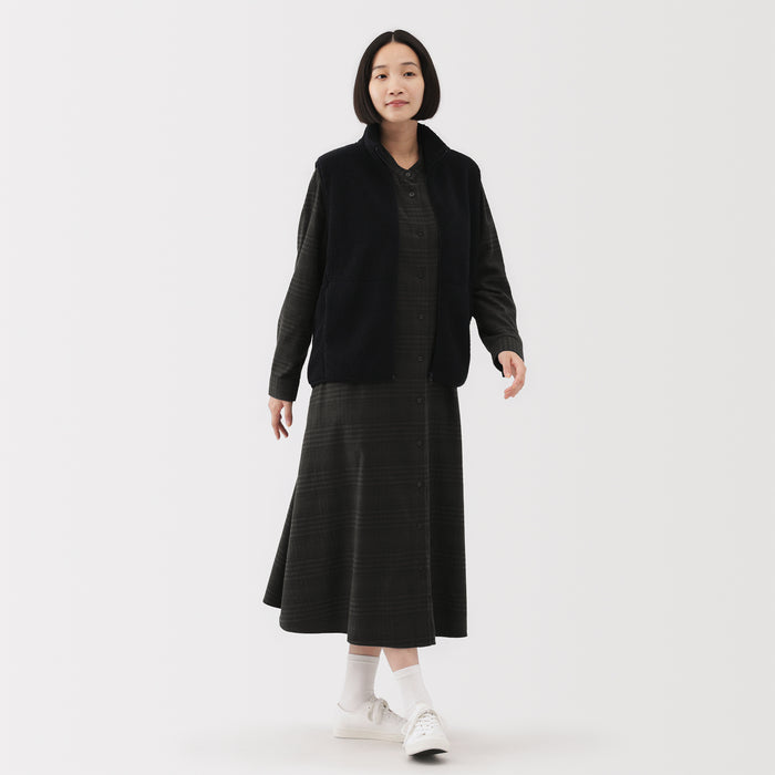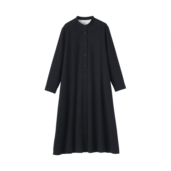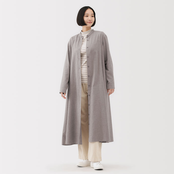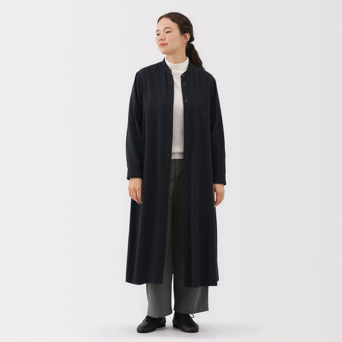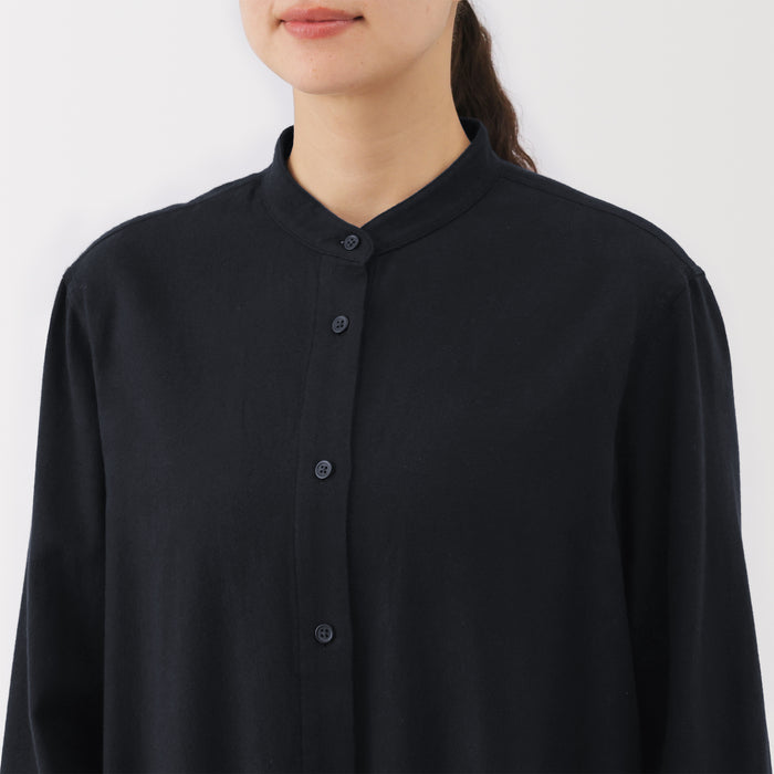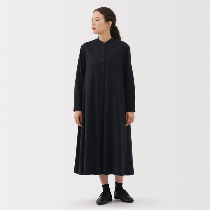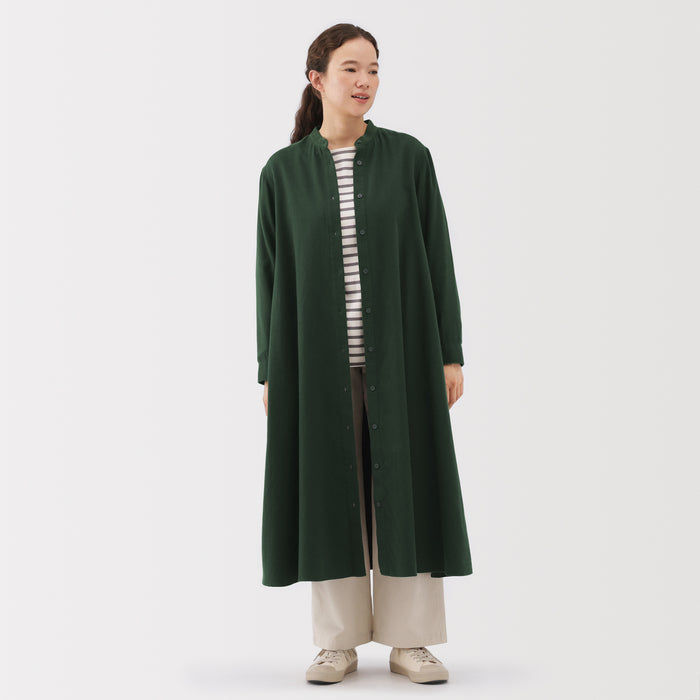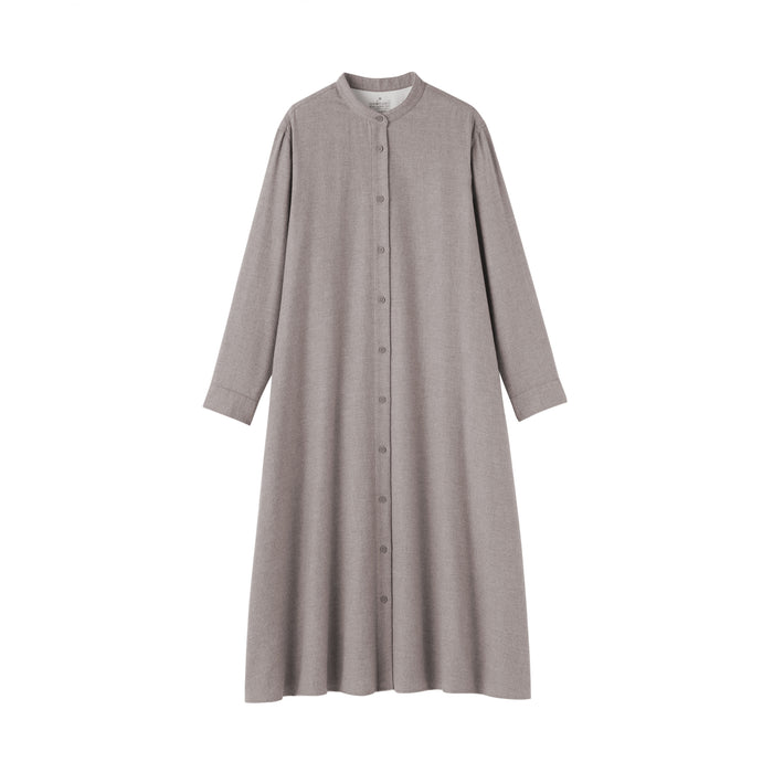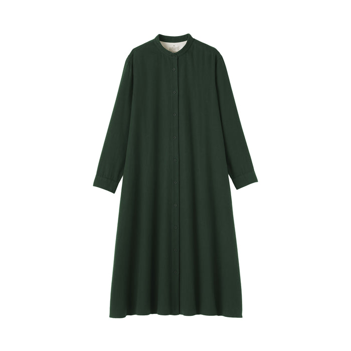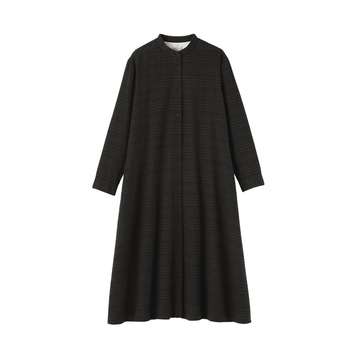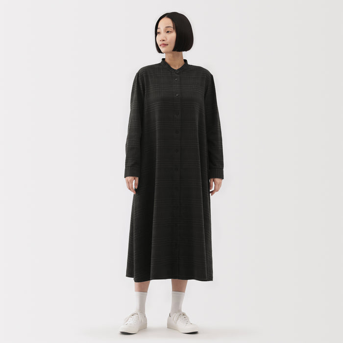 Experience ultimate comfort and warmth with this flannel dress, featuring a soft brushed texture on both sides. Its fitted neck, shoulders, and sleeves provide a flattering fit while the A-line silhouette allows for comfortable movement. The stand collar is loose around the neck to minimize bulkiness when layered.Ā