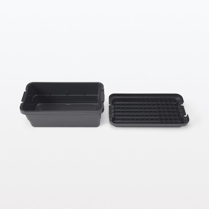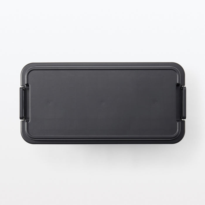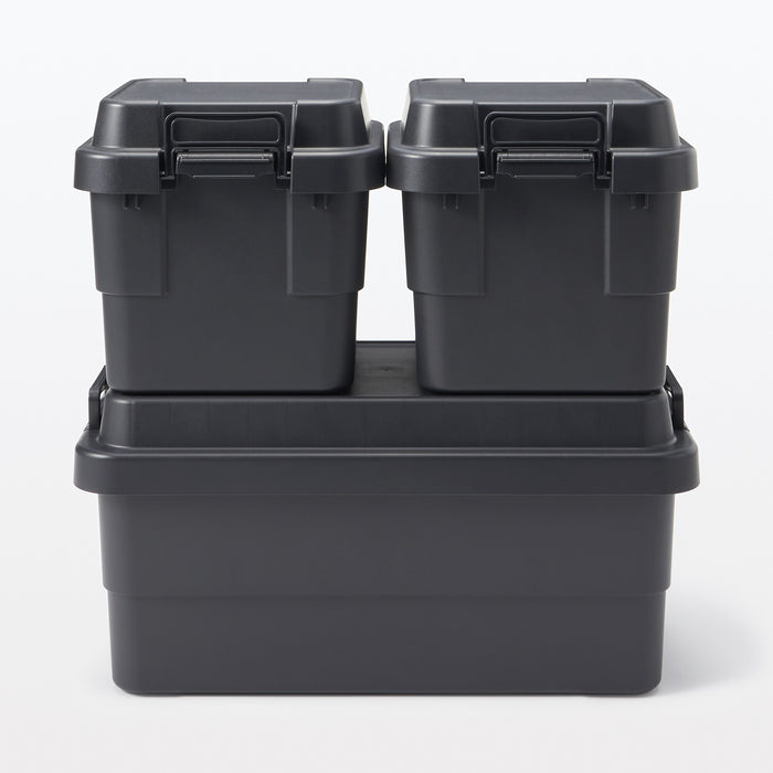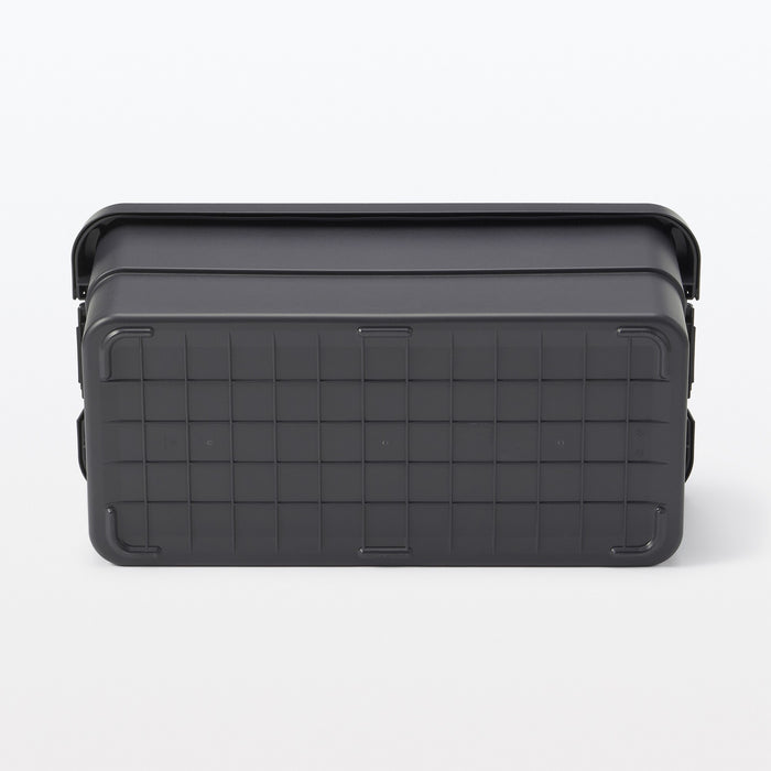A sturdy storage box made from heavy duty polypropylene that can be used both indoors and outdoors. The bottom features a grid pattern that provides more traction so it does not slip even when stacked, and the lid is designed flat and can be used as a table or seat.