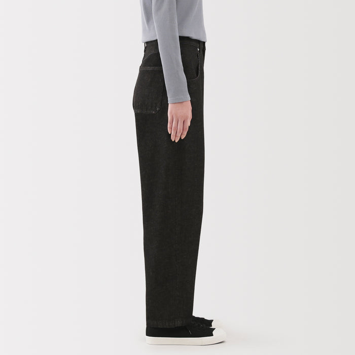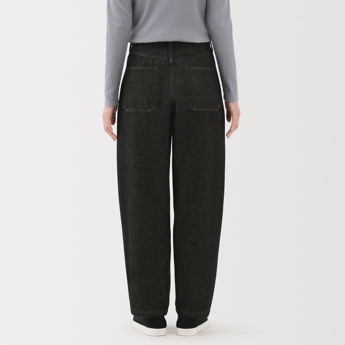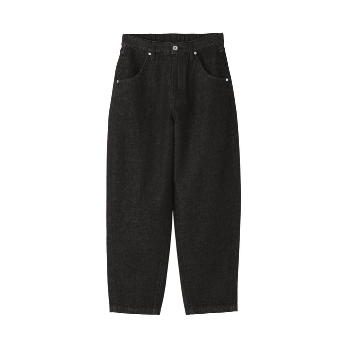 These denim pants are made from a blend of organic cotton and kapok fibers, making them lightweight and comfortable. The legs have a loose and subtle curved silhouette that tapers at the ankle for a fit that is both comfortable and flattering on any body type.