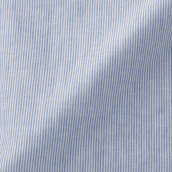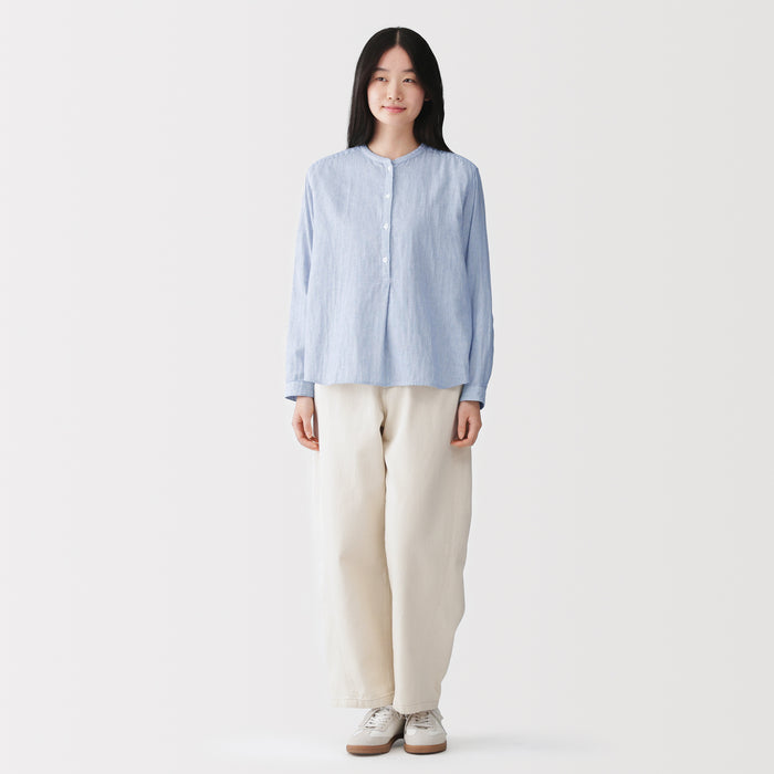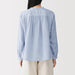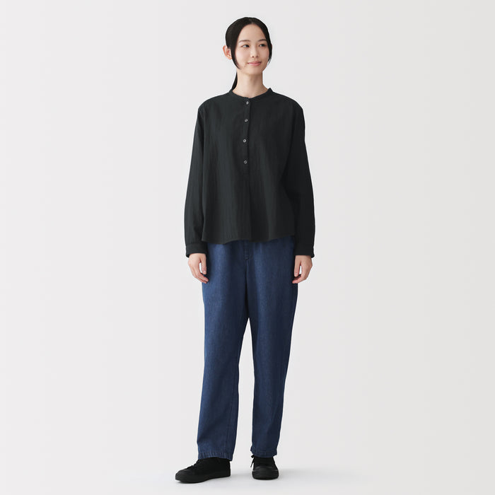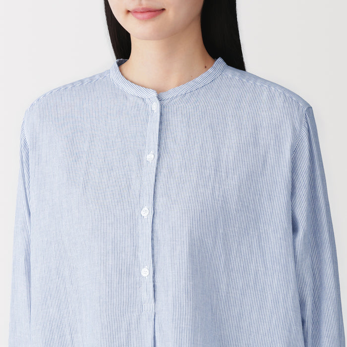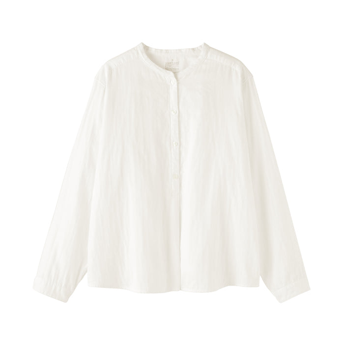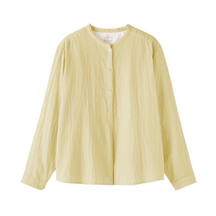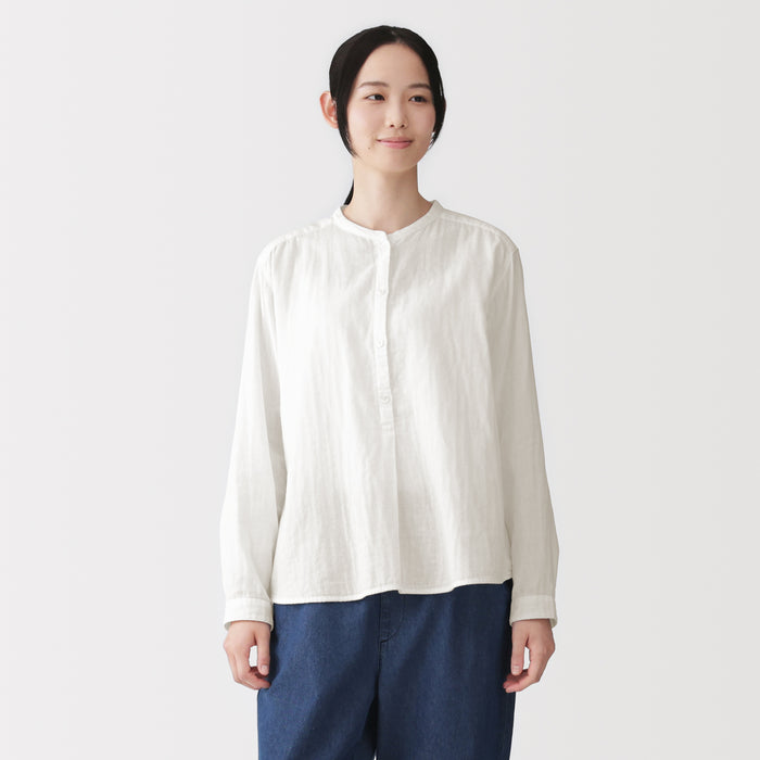 A women's long sleeve blouse with a clean stand collar and loose silhouette. The front has a basic, elegant design, while the back has gathers in the back for a softer look. Its double layered structure traps air between the gauze, making it lightweight and breathable.