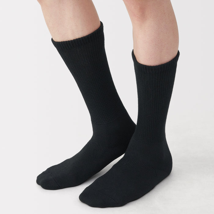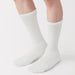 As the heel is at a right angle, the socks are knitted at a right angle to wrap comfortably around the heel and prevent the fabric from sagging and slipping off. Pile-knitted to create soft texture using cotton-rich yarn. The top cuff is designed to be less tight so it is more comfortable to wear.