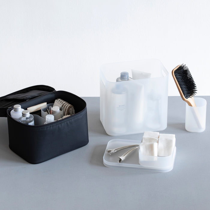 A makeup box made from partially recycled polypropylene that is sturdy and easy to clean. The translucent material also allows you to quickly see the contents inside, without adding too much visual clutter. Perfect for storing makeup brushes, toothbrushes, or even serving as a stand for pens and stationery.