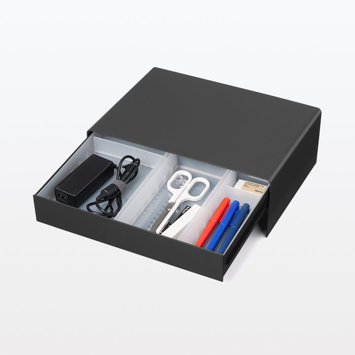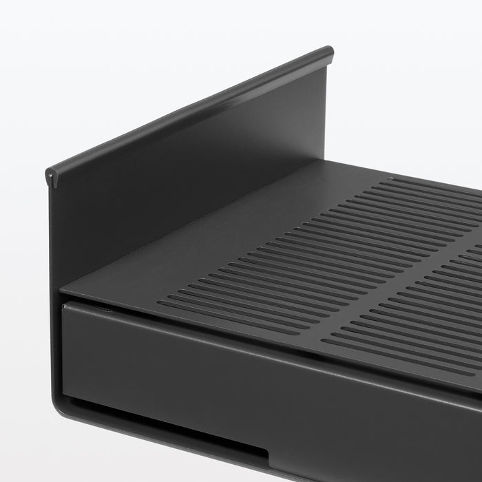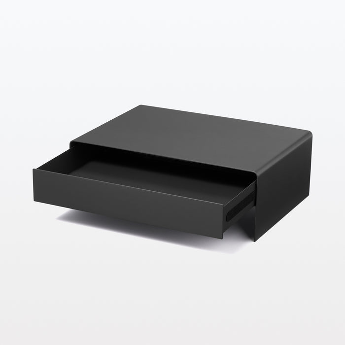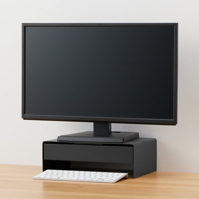 A monitor stand made from a single, sturdy steel plate. It can fit most 60% keyboards underneath (effective dimensions: W31.5 cm/W12.4"), and it includes silicone resin to attach on the bottom to prevent scratches to your desk. The drawer can be used for both item storage and cable management, and it can perfectly fit A4-sized documents inside. There is a gap at the top of the drawer that allows you to feed cables out while maintaining a neat exterior.