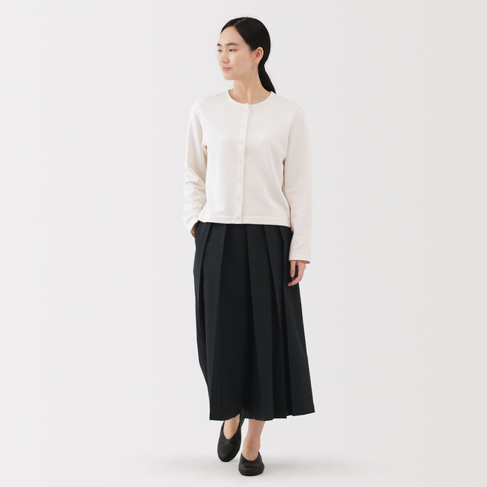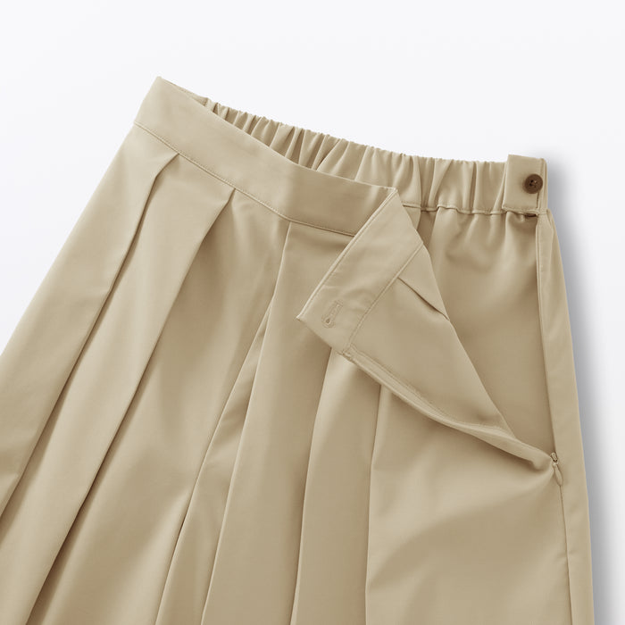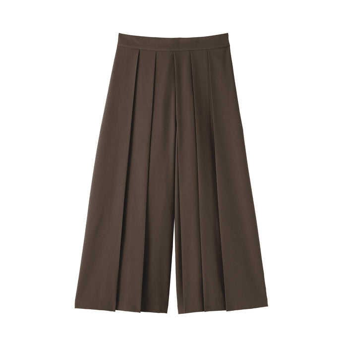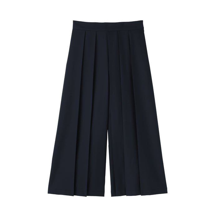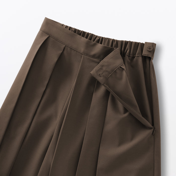 With a long length and wide legs, these pants have a relaxed silhouette that is flattering on everyone. The front of these pants feature neatly pressed pleats, creating a skirt-like appearance. Designed with a side zipper and a stretchy back waistband to allow for flexibility and movement throughout the day.