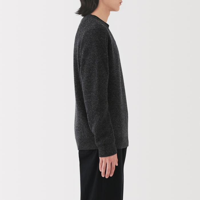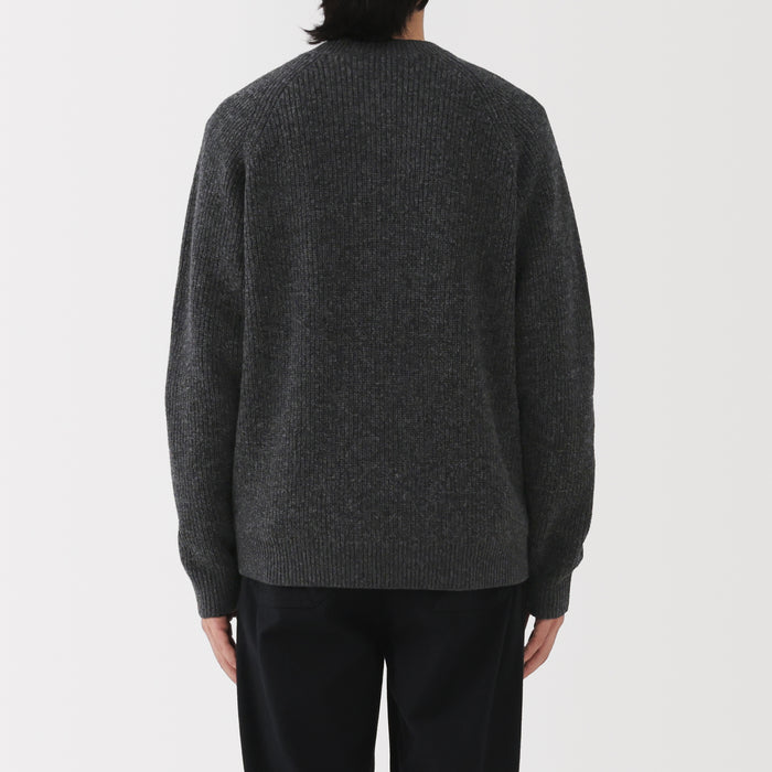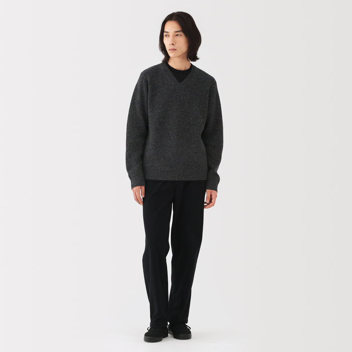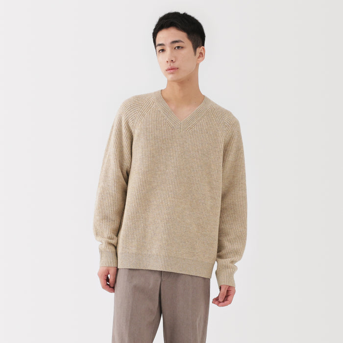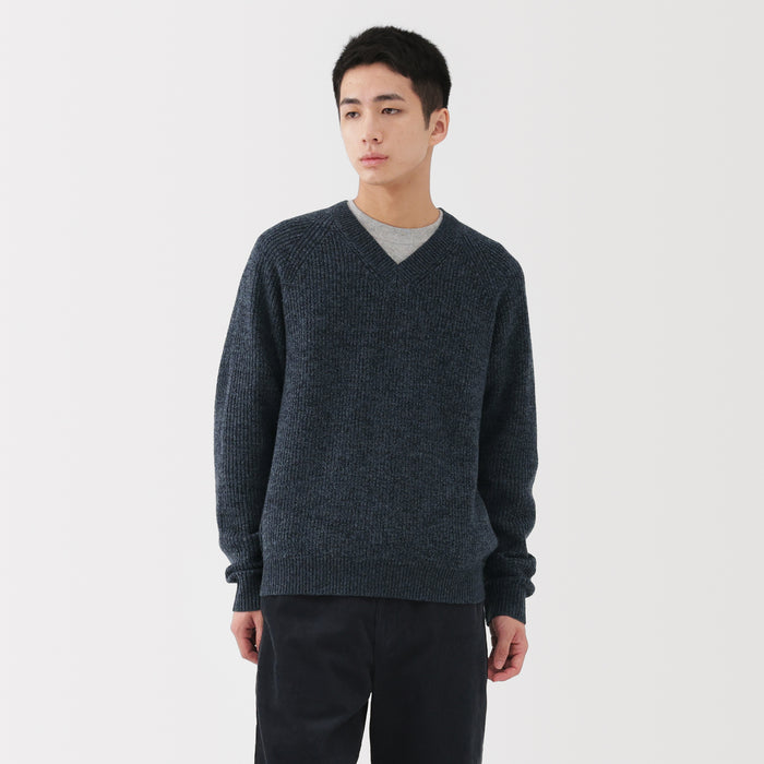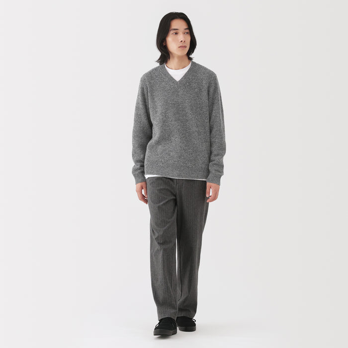 This men's mid-gauge wool V-neck sweater is crafted with a knit that combines two yarn thicknesses twisted together, resulting in a lightweight, soft, and fluffy texture for comfort.