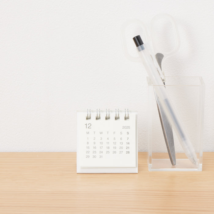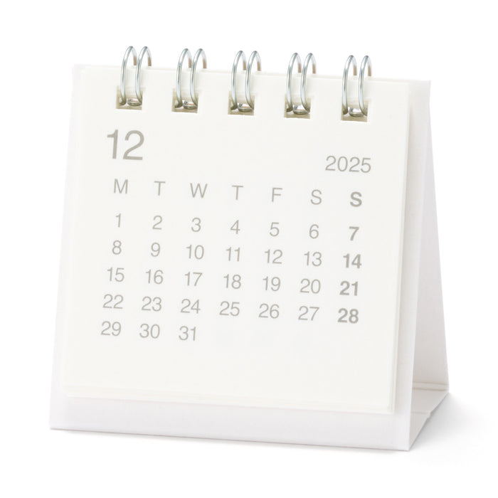 A compact monthly calendar with an easy-to-read design, made from recycled paper. It takes up little space on your desk, and it's perfect for those who need to reference dates often. Sundays and holidays are in bold for a simple and clean design. The months start on Mondays, dated from December 2025 to December 2026.
