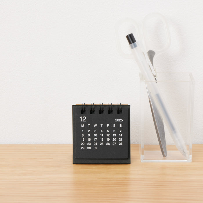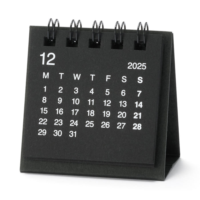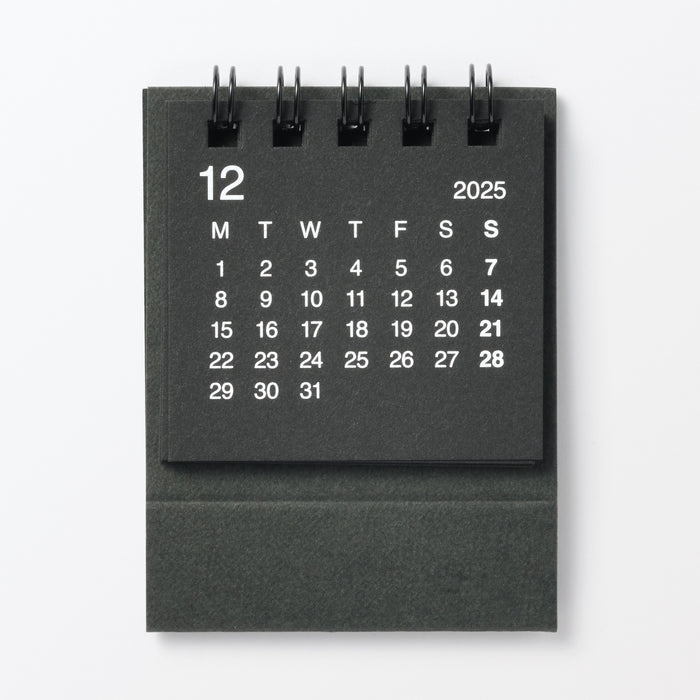 A compact monthly calendar with an easy-to-read design, made from recycled paper. It takes up little space on your desk, and it's perfect for those who need to reference dates often. Sundays and holidays are in bold for a simple and clean design. The months start on Mondays, dated from December 2025 to December 2026.