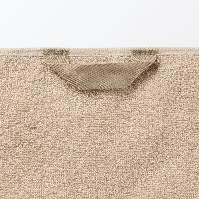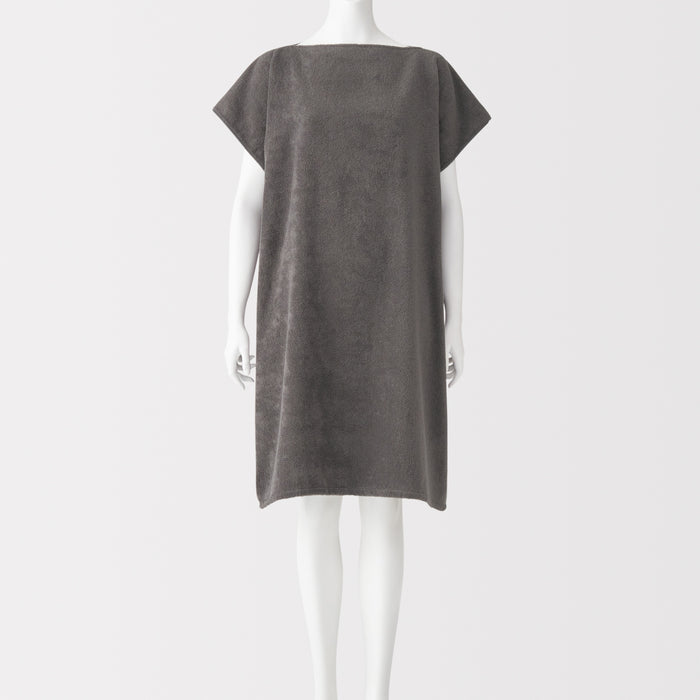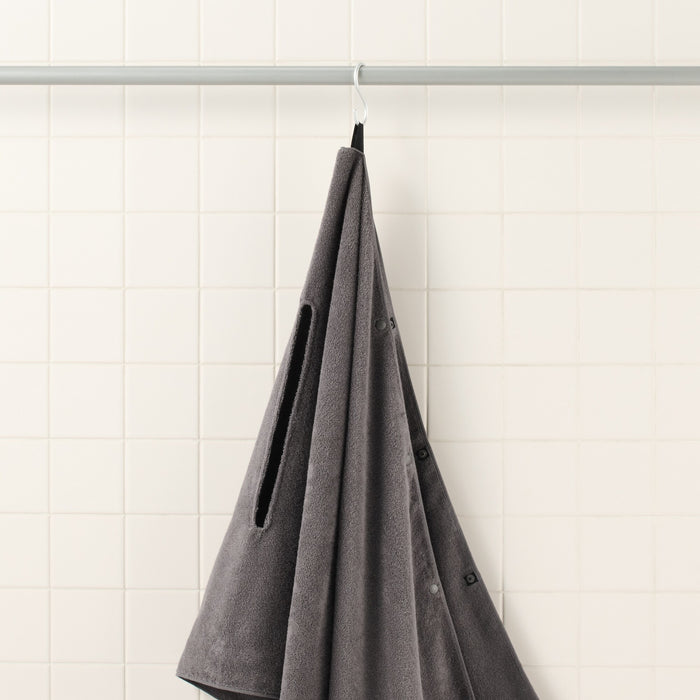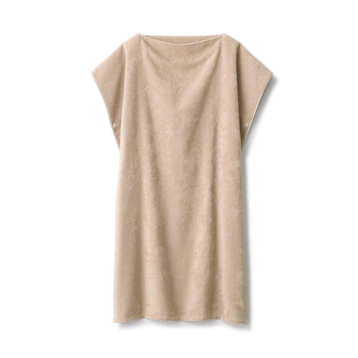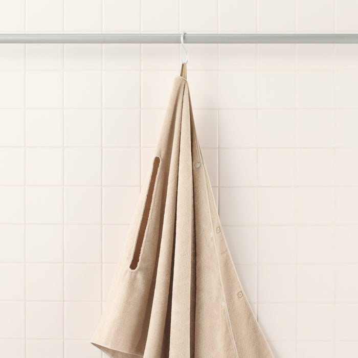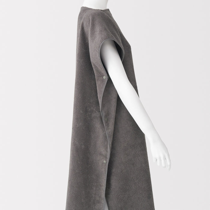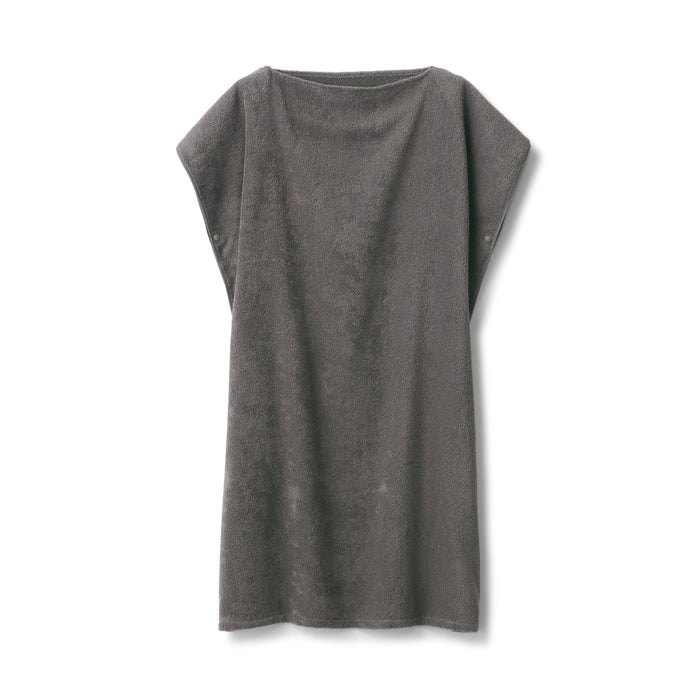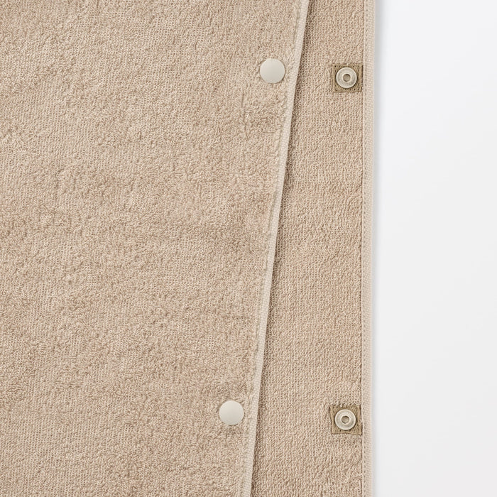 This long bath towel is made using lightweight cotton pile fabric for a soft, fluffy texture. It features a hole in the center for your head and snap buttons on the ends so it can also be worn as a poncho. This design is convenient for slipping on right after a bath or shower, and it also functions well as a cover-up after swimming at the beach or pool. There is a loop for hanging on a hook.