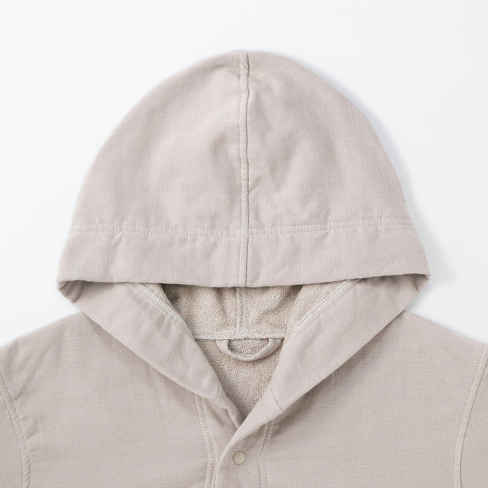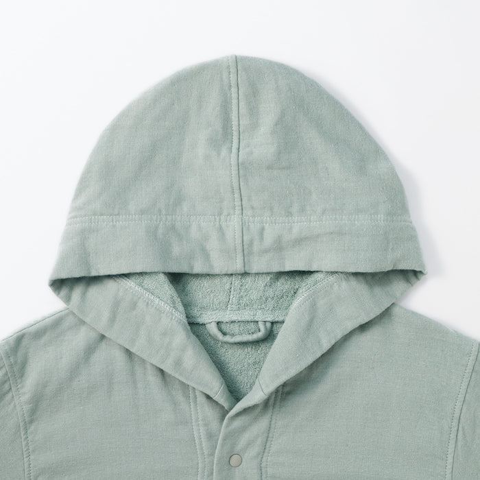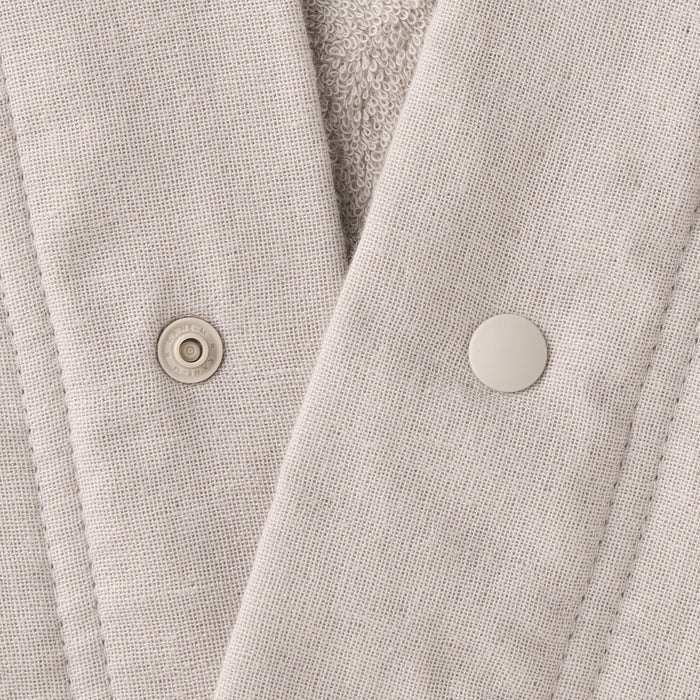 This bathrobe features cotton gauze pile that creates a soft and light weight fabric. Its seamless sides ensure added comfort, includes a hood for drying your hair, and the buttons allow for easy fastening.